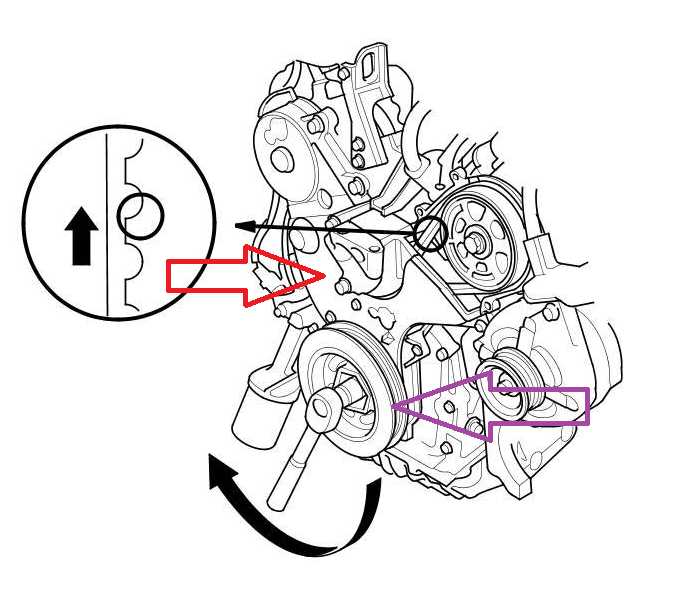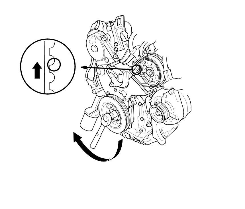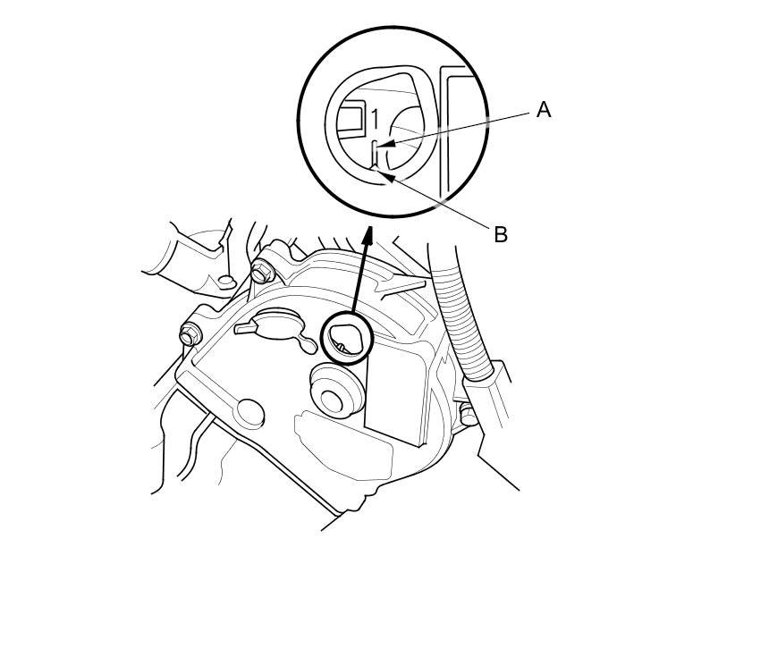 1.Turn the crankshaft pulley so its white mark (A) on the crankshaft pulley lines up with the pointer (B).