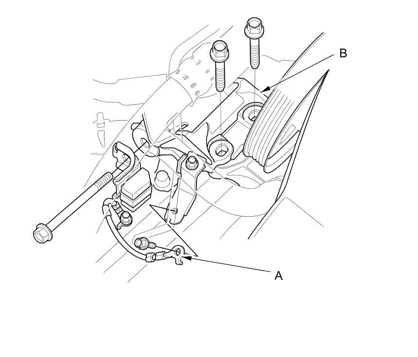 7.Remove the ground cable (A), then remove the upper half of the side engine mount bracket (B).