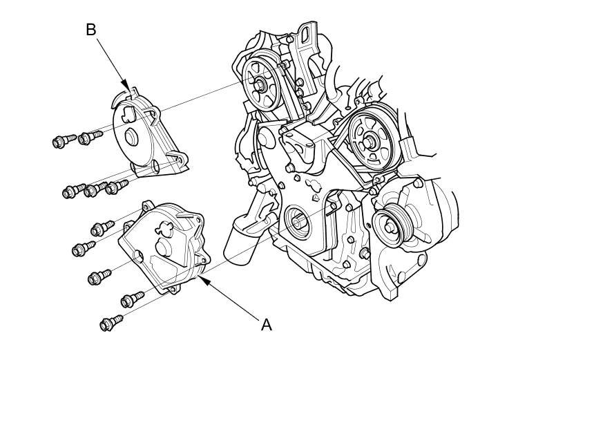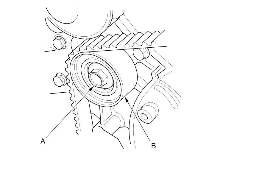 15.Remove the idler pulley bolt (A) and idler pulley (B), then remove the timing belt. Discard the idler pulley bolt.