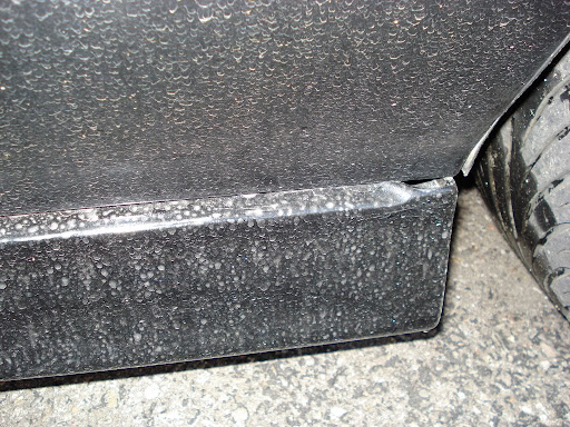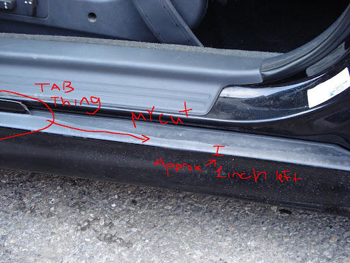 NO EXTENDING OR SHORTENING etc etc. The 4 door side skirt will have two tab thingys originally. You must cut off the rear one on each side so that they'll fit. We only need one tab, and can only use one tab. Because it was meant for a 4 door., they have 2 tabs. So we chop it off. Leave about 1 inch so that the cut won't show. I wasn't to worried about my nasty cutting skills, since it's only seen with the door open. I did it with a jigsaw. Very simple.