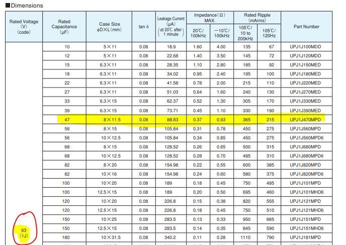 I couldn't find an exact match for the Nicochin capacitor so went with UPJ1J470MPD from Mouser with same 63V, 47uF, 105degC ratings.