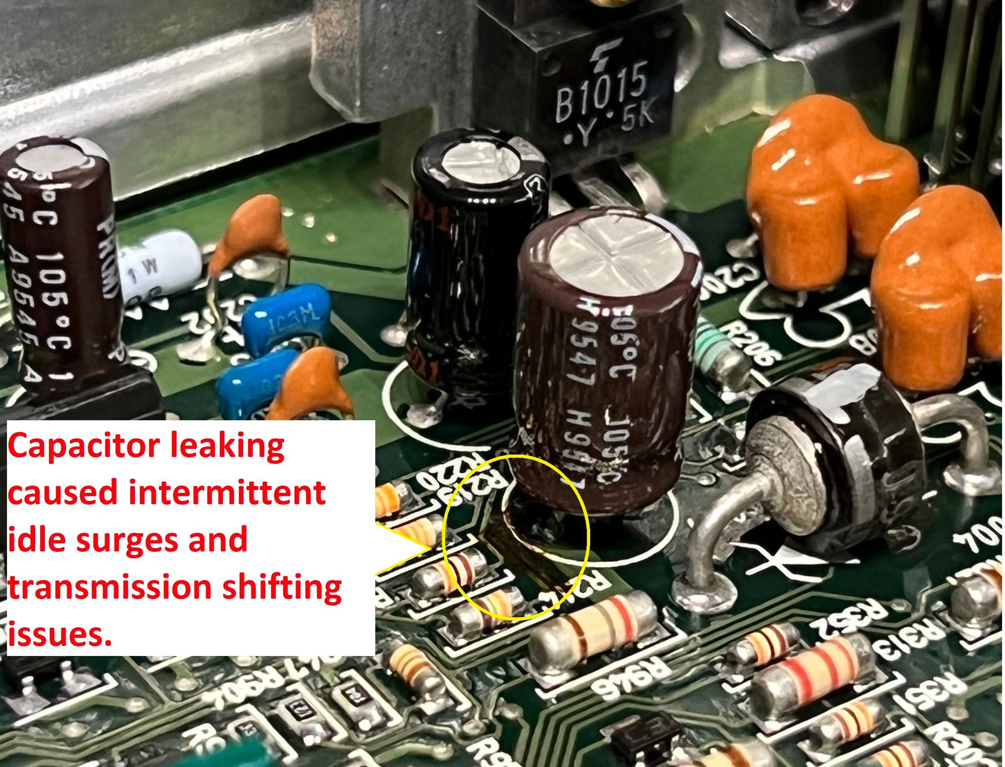 De-soldered bad capacitor and cleaned up board some more to remove excess solder and used heat resistant tape to tape over traces to prevent further damage if new capacitor were to ever leak. Had to remember the negative side (white stripe) needed to match up to the negative sign on the board before soldering new replacement capacitor. Reinstalled repaired ECU, hooked up wires and fired up the engine crossing my fingers that it would fix it. Engine warmed up and then idled low as usual with no more surging. Let it run for 10mins before taking for test drive. No more hard shifting from transmission and it now shifts at usual lower RPMs. All is well now so saved me money from taking into shop to have it diagnosed with costly bill.