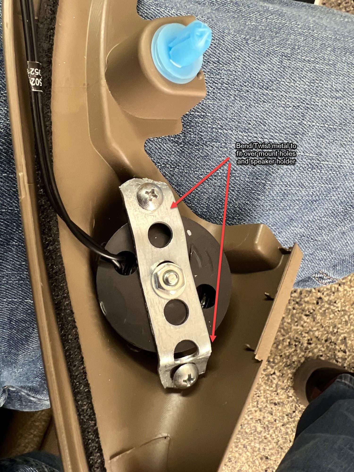 After speaker install front door Original tweeter - note angle of tweeter. Can't use old metal mount. Need to adapt new tweeter and surface mount to existing area Used metal bar by twisting/bending metal to mount tweeter
