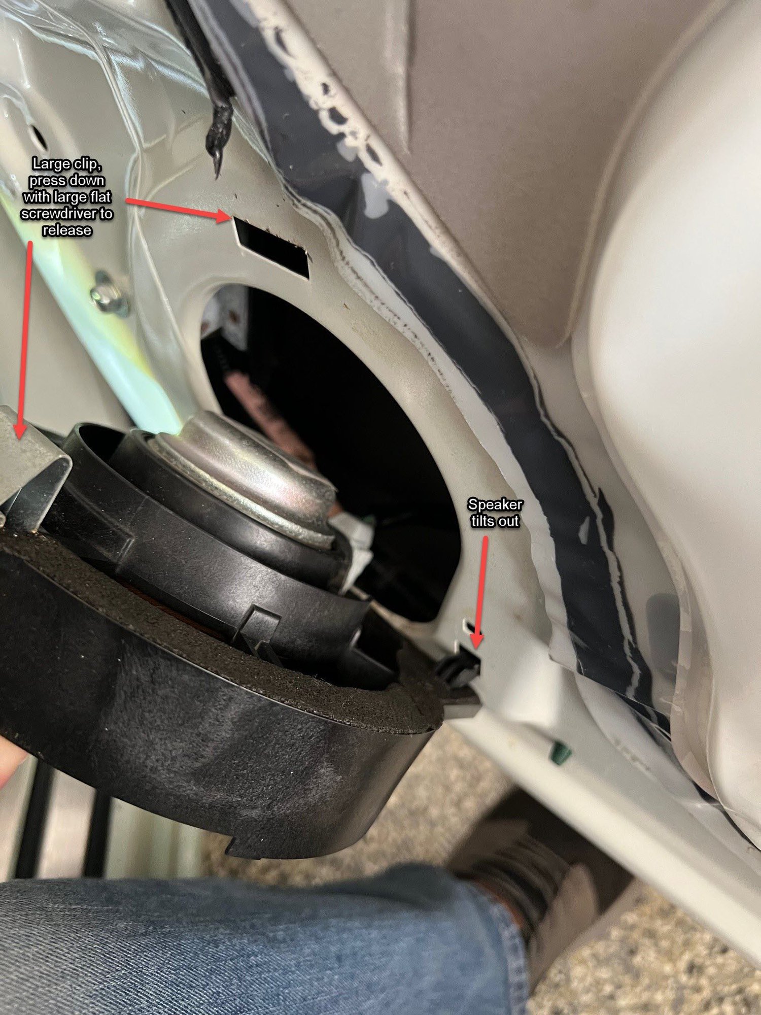 Removing the door woofer is fairly simple by inserting a large screwdriver in the top of the speaker mount and pushing down to release the clip. After that is released, the speaker tilts out.