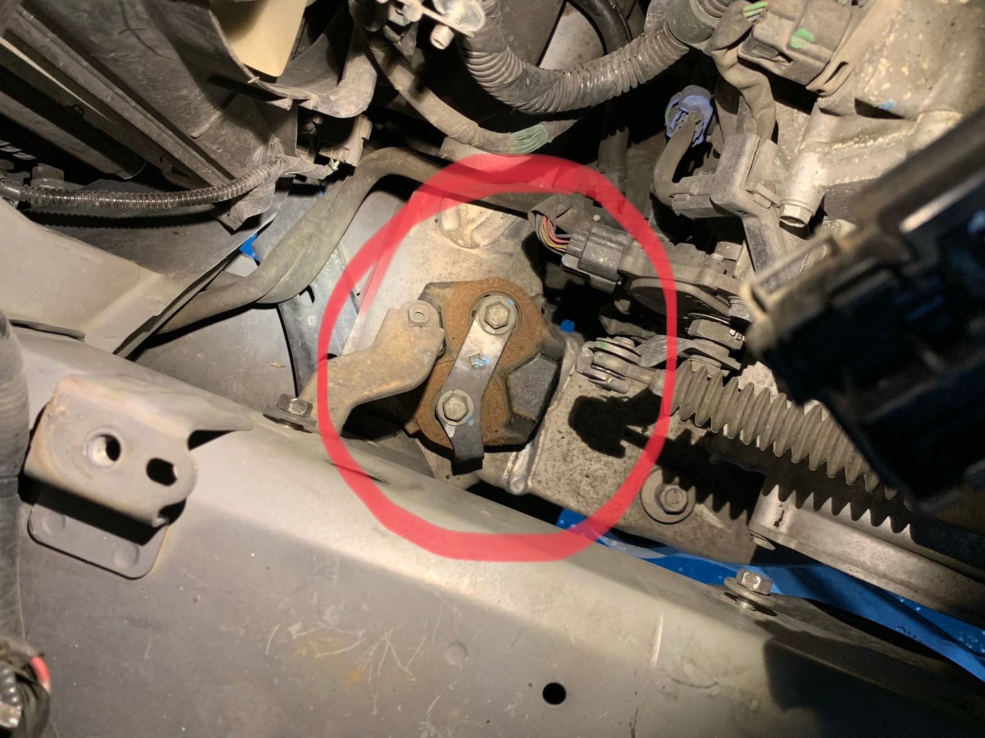Some pics to help This is right against the sway bar back side under the transmission I bought this mount, should be front upper but there isn’t anything like it around This is lower left under headlights and battery box, i have no idea what it is or what it does. Expensive mount broken.