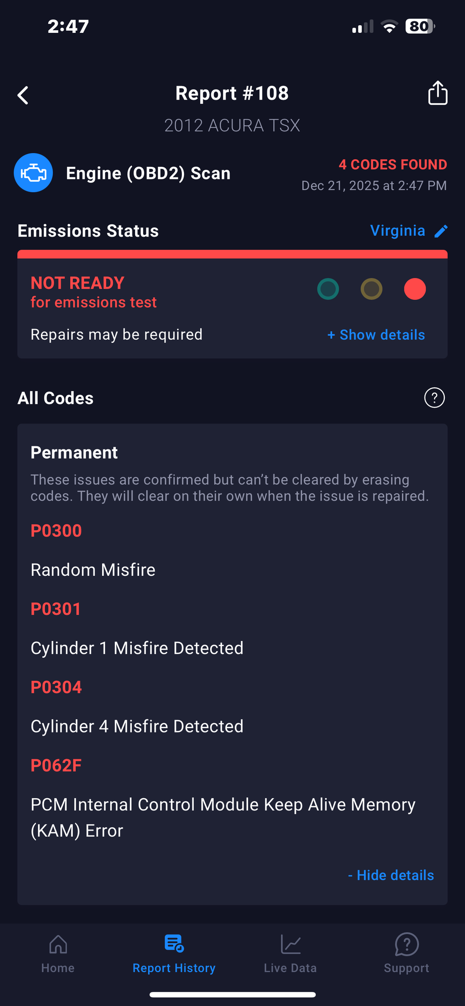 I have a 2012 Acura TSX, I am having issues with a misfire. How this started is after getting gas which was 93, the car died down on its own on the way home. Once home tried starting and car was throwing black smoke out the exhaust and continuously cranking but not starting and no CEL. Checked out Spark Plugs and they were fouled in carbon so decided to replace, along with this decided to replace ignition coils as well. Tried starting and same crank but no start, opened fuel injectors and checked and replaced as the black smoke was thick and i thought maybe it is a fueling problem. Decided to check the codes and got a MAF code so cleaned MAF put back in and did not work, decided to replace and tried starting and same issue. Tried cleaning throttle body but bricked it and decided to replace that as well. Car now starts after a couple tries but struggles to stay on, when trying to drive it bogs out and dies and now the codes that I am getting are Cylinder 1 and 4 Misfire and P062F, naturally replaced the spark plugs and ignition coils to different cylinders and same cylinders are misfiring.