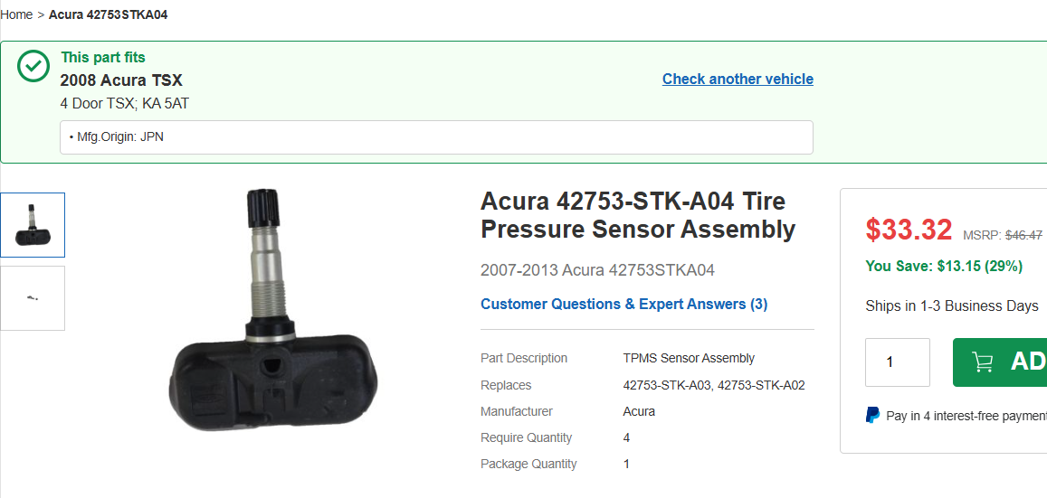 I recently purchased a set of OEM TPMS from ebay. The seller's posting that they are compatible with my 2010 TSX Tech model. The part number is 42753-STK-A04. Can someone confirm that these will work in my vehicle before I have my local tire shop install and program them?