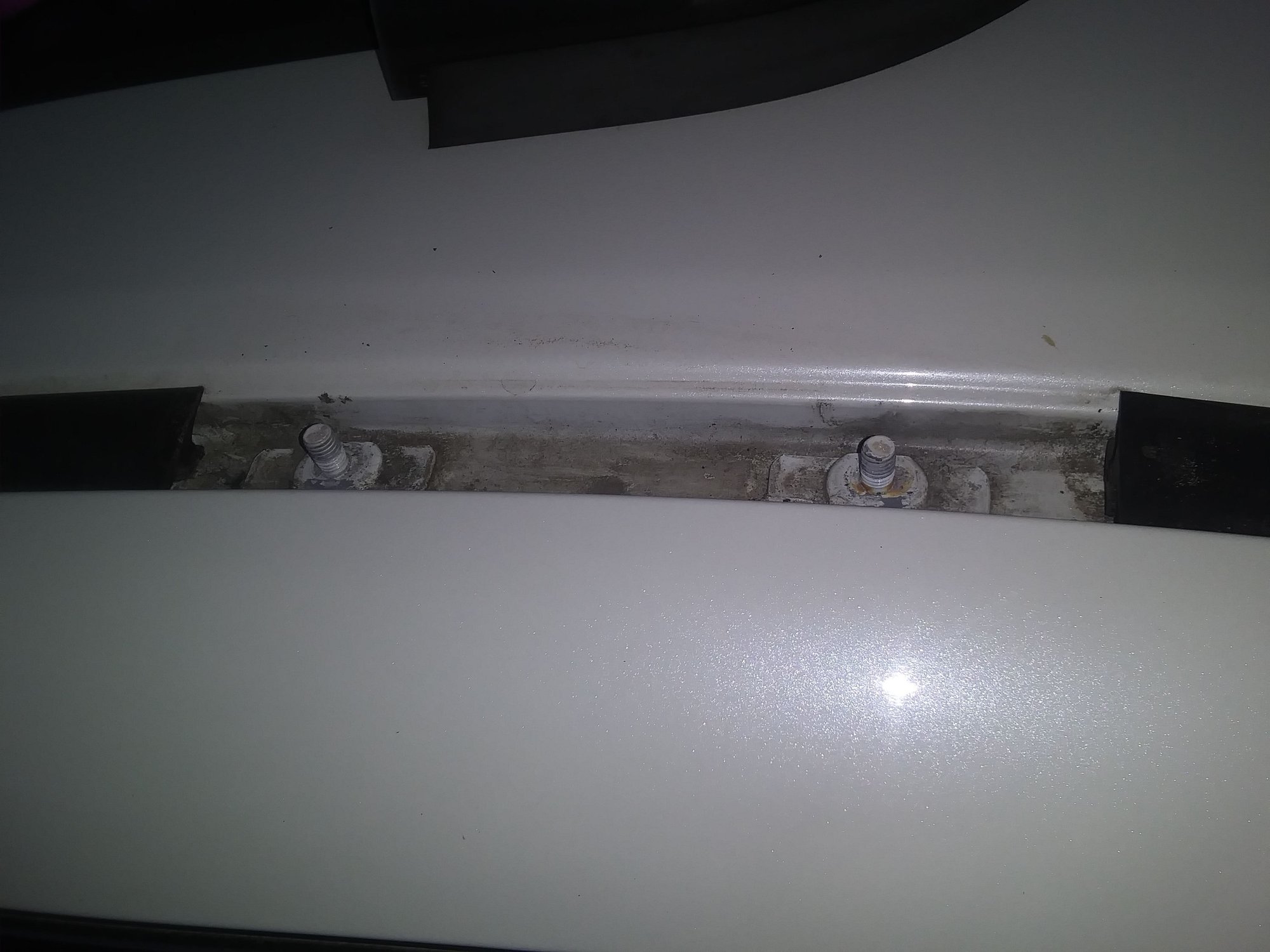 Now that you have your pieces cut to desired length it's time to cut them up to fit over/around those pesky mounting point studs. This is the most time consuming/pita part but in all reality it's not hard. What i did was press the pieces onto the mounting studs to get an idea of where you need to cut. Place the molding into the channel as if no studs were there, press down firmly, it leaves an impression that you can go over with a marker so you dont lose them. On one side i tried drilling but I came across 2 problems.