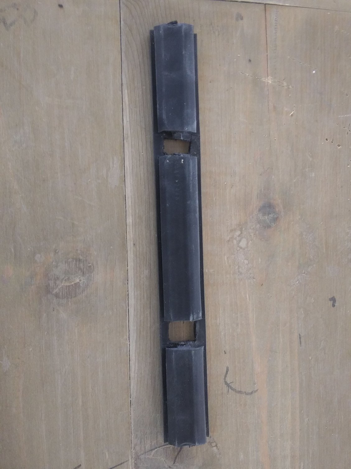 after you make your marks use your blade to cut the rubber down to the metal like in the picture. Once you reach the metal strip use the dykes to cut the metal strip out. After you finish that up lay the piece flat and cut out squares in the rubber so the studs can poke through. The studs will come up almost flush to the rubber but barley. If you dont do this the trim will bulge and if you lay the molding o. Top it will bulge and leave a gap. This or something like this should be your finished product.