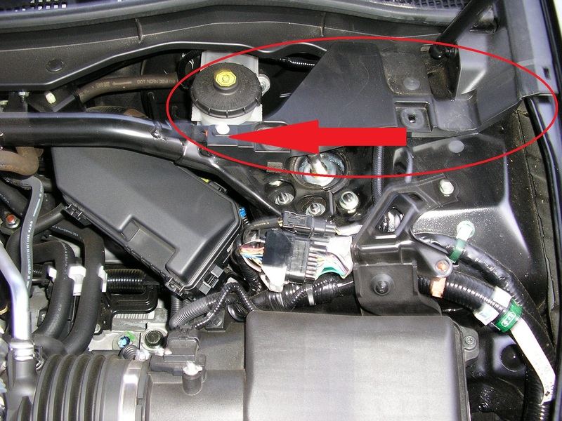 Step2: There is a white clip(one on both sides of sway bar that keep some plastics attached. Pull up gently on these or pull the black plastics toward the front of the car to release from the white tab. This will reveal six nuts holding the strut in place.