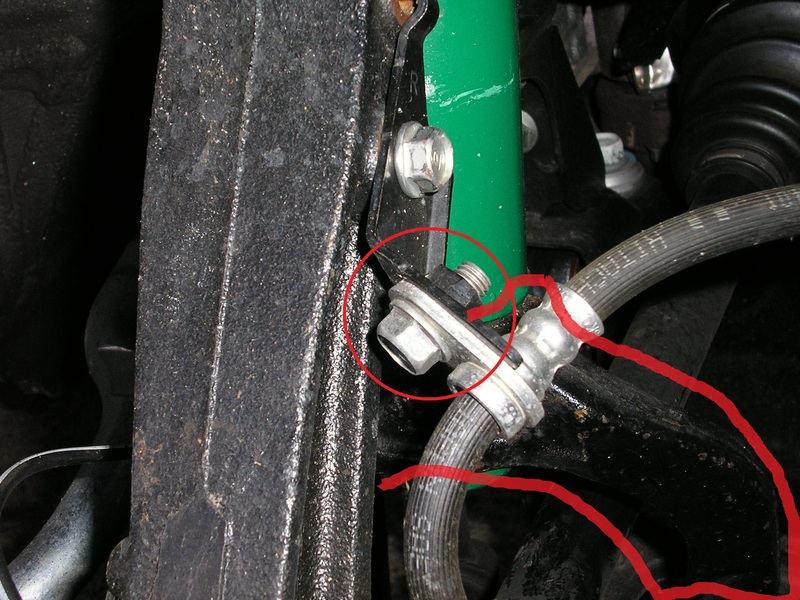 Step5: Note that I already have my Tein coilover installed. So the green in this photo stock should be black. But in this step you need to remove the circled bolt (10mm) in order to relieve pressure off this line when you remove stock strut. Return to top of car where the six nuts are. Remove all six of the yellows, unclip the hose connected to the sway bar(noted in picture from step one), and remove sway bar, set to the side. In this picture you will see my horribly outlined horseshoe shaped piece. You will need to remove this from the bottom of the stock strut and replace on the front strut when you install coilovers.