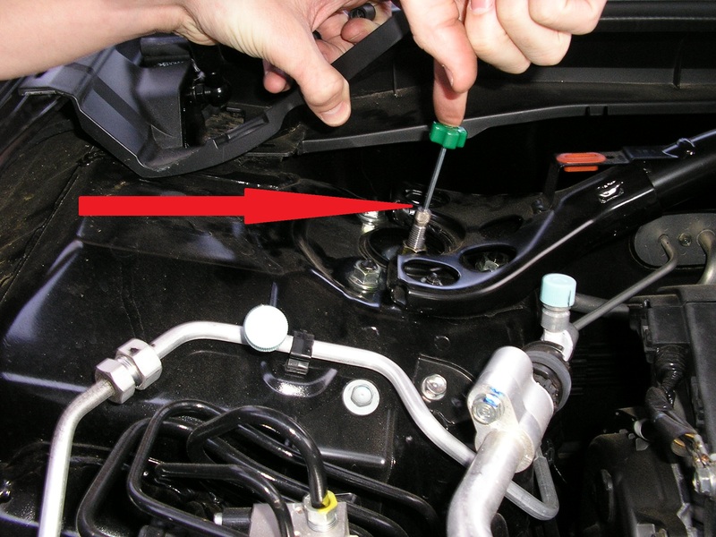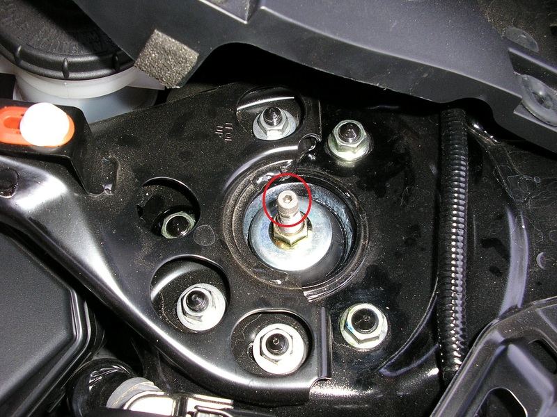 Step9: Once your ride height is adjusted to you preference, now time to adjust your ride stiffness. Return to your engine bay where you removed and replaced the six bolts, on top of your strut sticking up you will have a little black cap on top, remove that and you will see what I have circled.