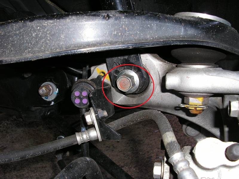 Step 11: The photo is taken from the backside of the passenger side rear tire. The circled bolt is a 17mm bolt. Remove this one first and then press down or have a friend stand on your rotor to release the strut from it.