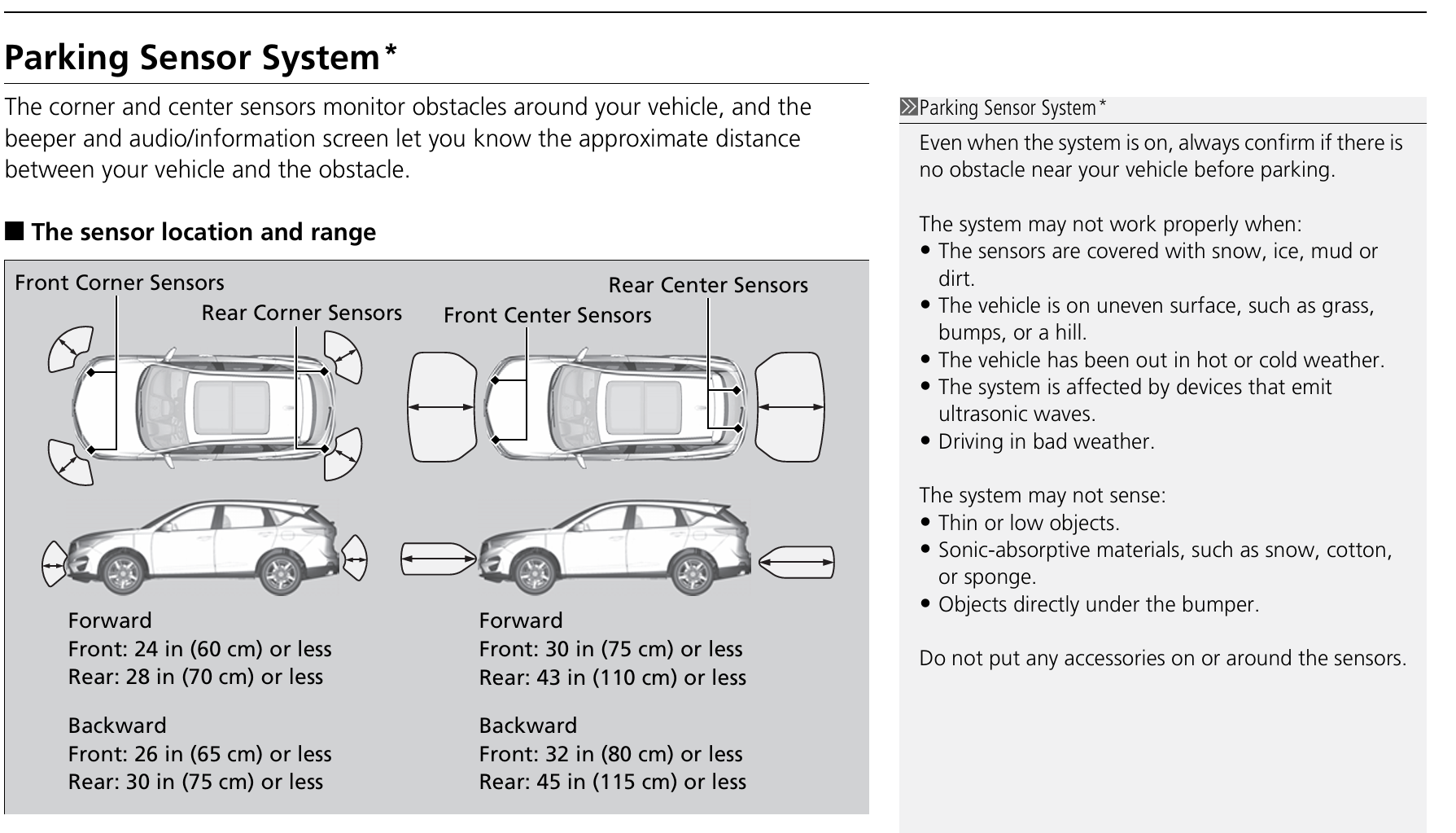 Well I definitely appreciate your very informative answer, but maybe you can still help an old timer out and quote the exact line from the manual that states...."pressing the sensor button to off only silences the audio warning (beep). Or maybe you can quote the line from the manual that states..."When the sensors are on, the front sensor only warns you that you are getting close to an object but will not automatically apply the brakes". Or maybe you can quote the line in the manual that states...."When the sensors are off, the reverse sensor will still cause the vehicle to apply brakes automatically when you get to close to an object". And it's always good to keep in mind that not all pre-owned vehicles come with an owners manual so some new owners look for help from other owners. Thanks