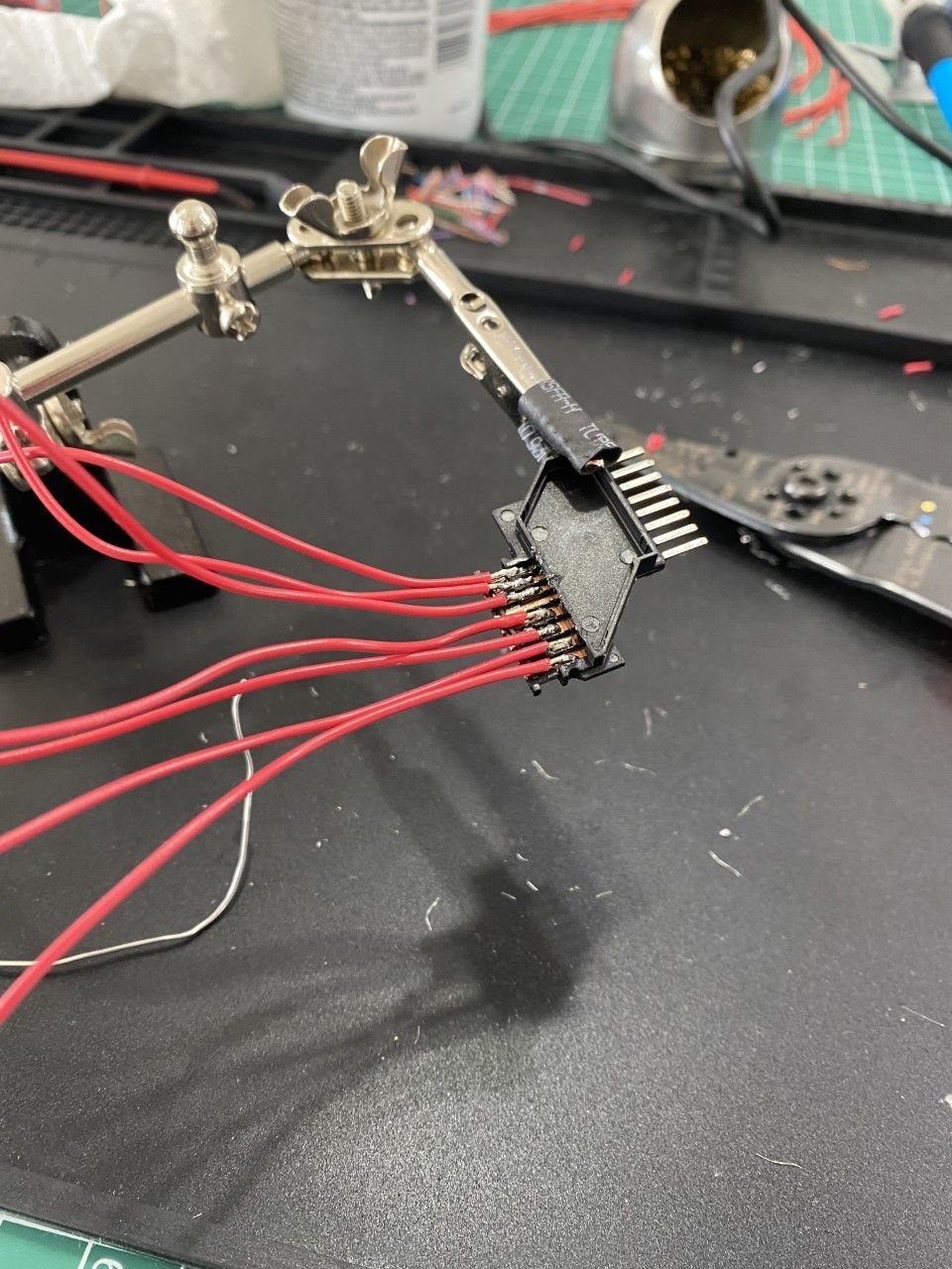 C. Once I had both pieces, I disassembled the clock spring female connector and soldered red wires to the pins.