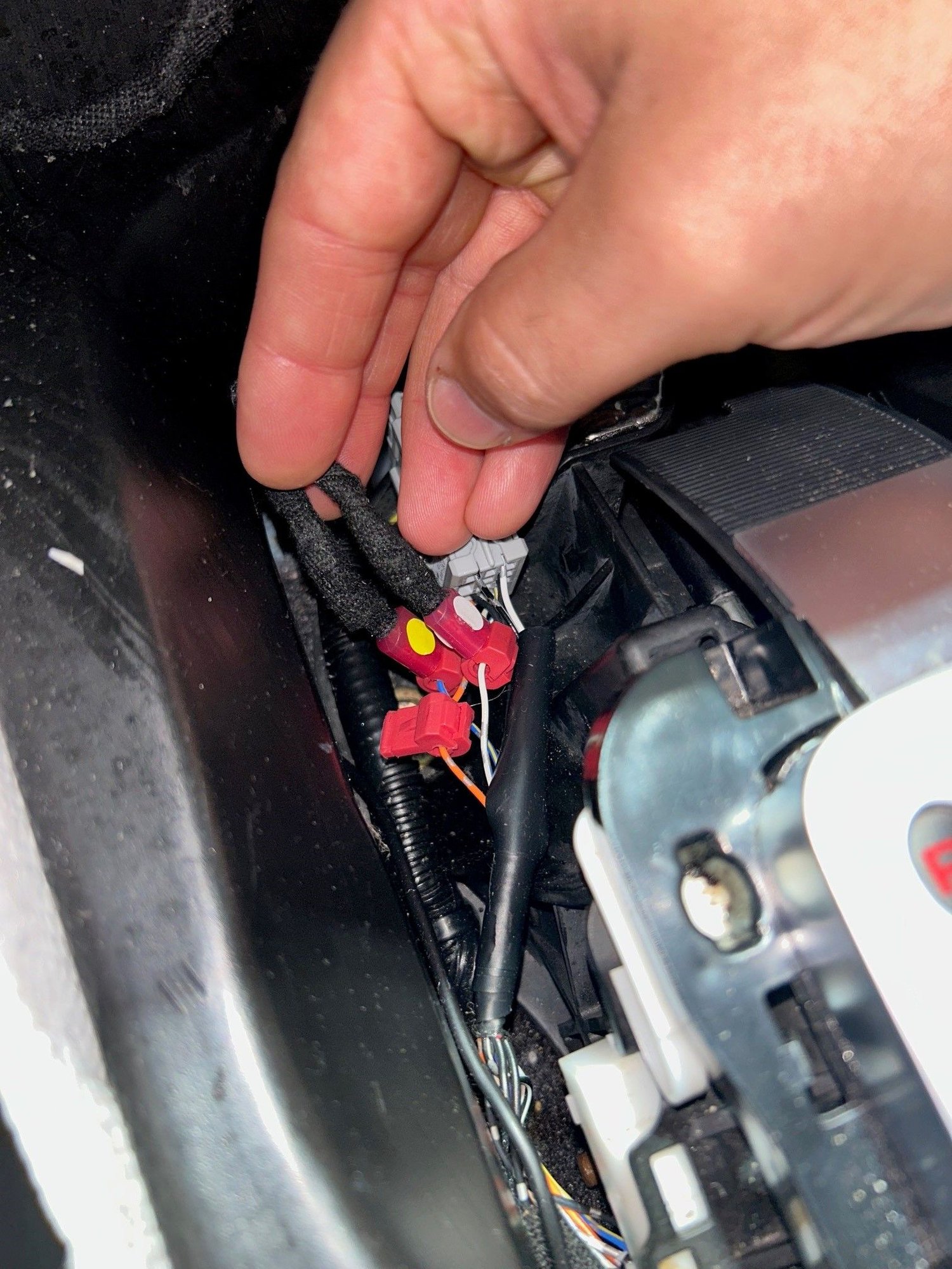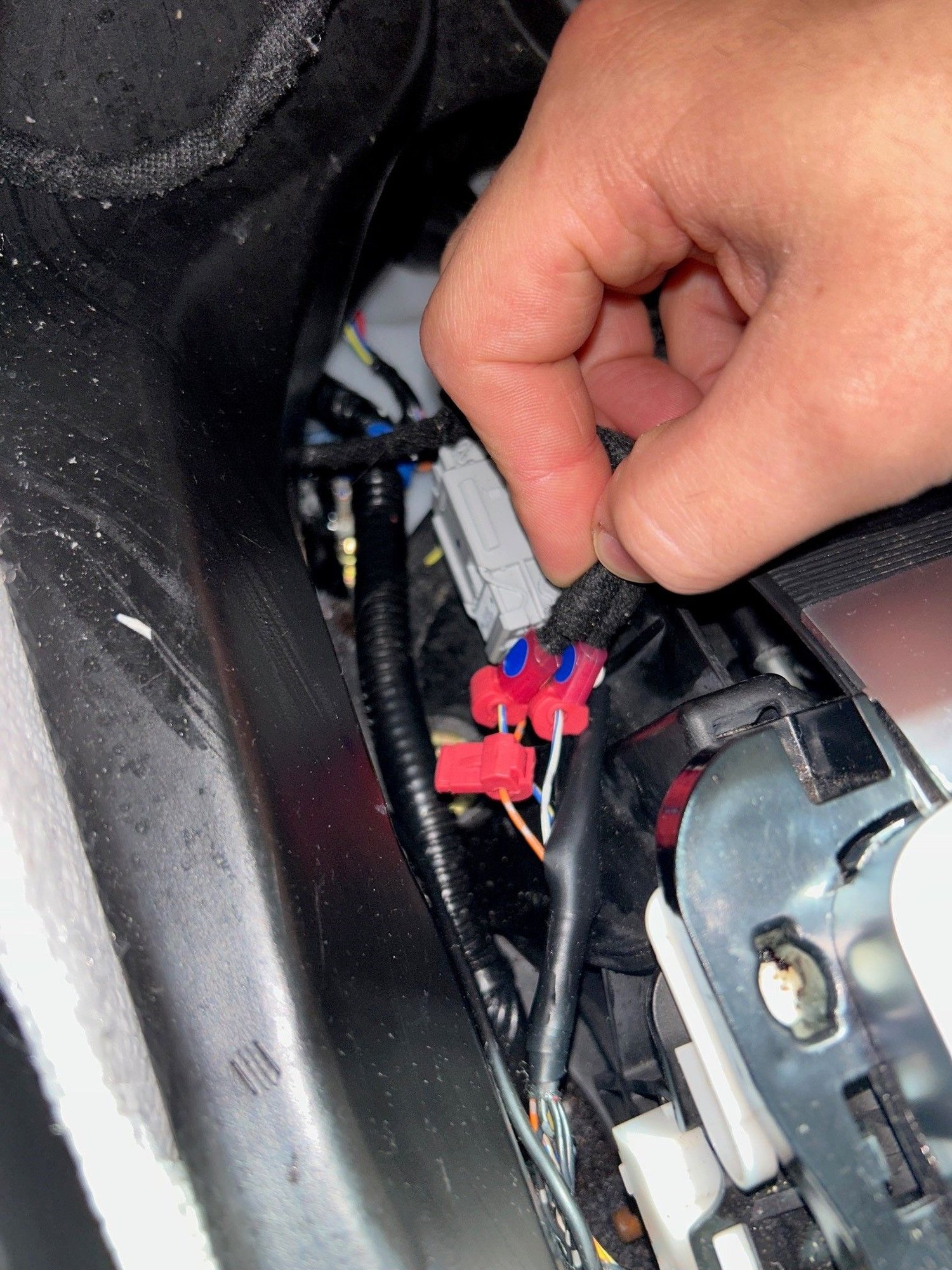 A. I used T-taps and spade connectors to tap into the wires for the paddle shifters. Please note I had a lot of trouble at first after thinking I was supposed to tap into the ORN wire (You'll see an empty/unused T-tap in my picture below.). I later found out that I needed to tap into the BLU/YEL wire and the BLU/WHT wire.