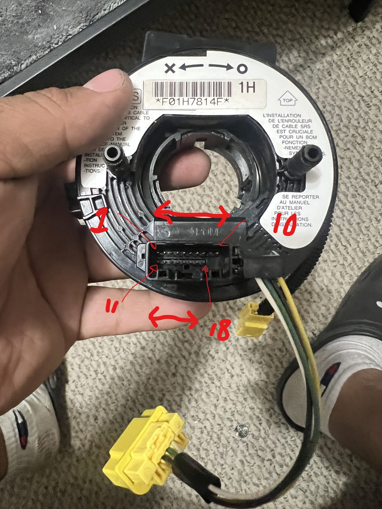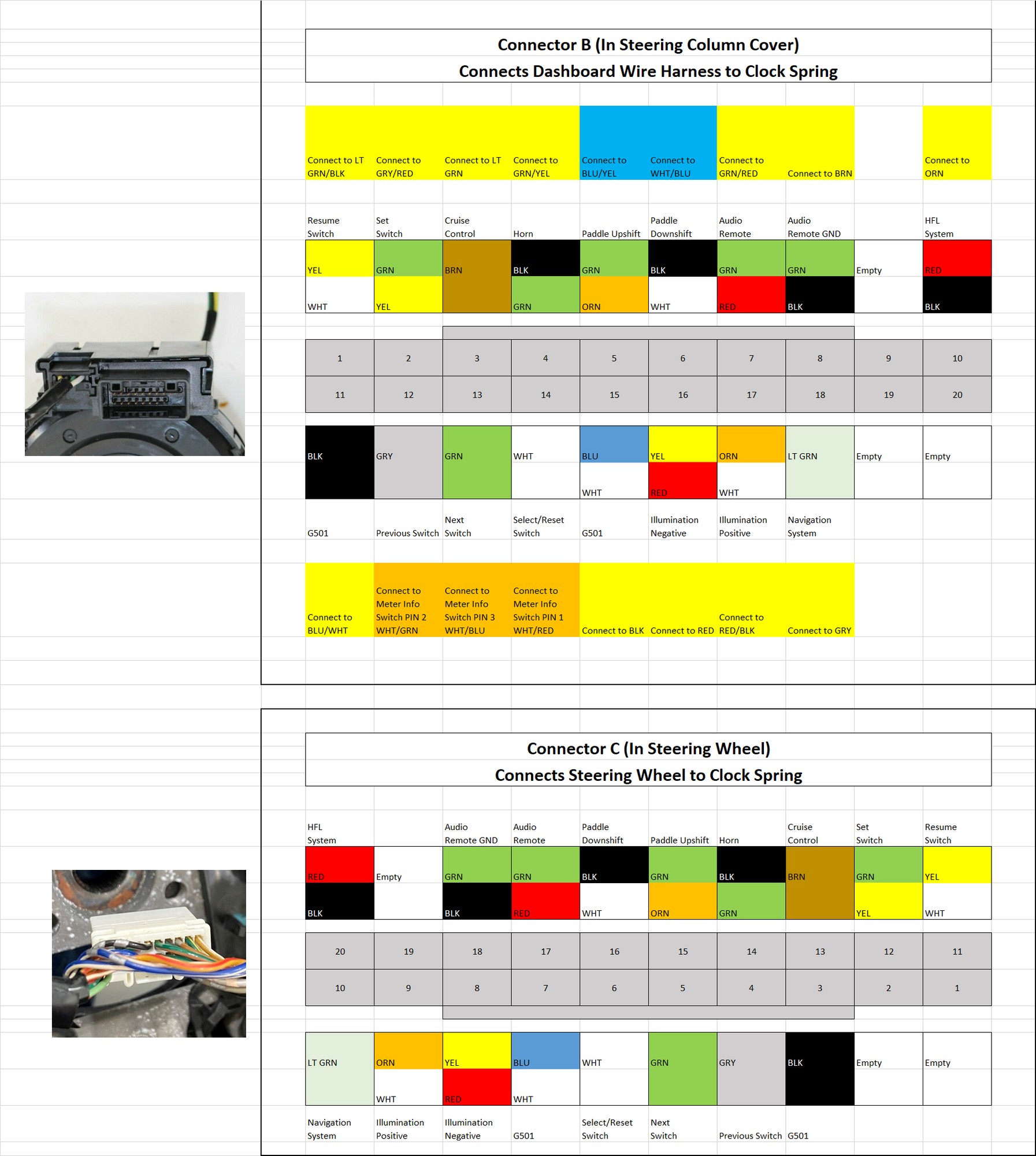 Okay, so this part was a bit confusing, but it requires some clarification. My DIAGRAM 1 and your picture are NOT the same. What I can tell you is do NOT focus on the pinout that you created/posted above (i.e. the male plug that sits inside the steering wheel). The reason I say this is because the pinout locations actually flip from the front of the clock spring to the rear of the clock spring. For example, the top row and bottom row flip-flop and also they flip left/right inside the clock spring. It makes it a bit confusing, but you can use a multimeter if you want to double check the front pins and back pins of the clock spring yourself. Trust me, focus on my DIAGRAM 1. This is the rear of the clock spring that you will plug your custom wiring harness into.