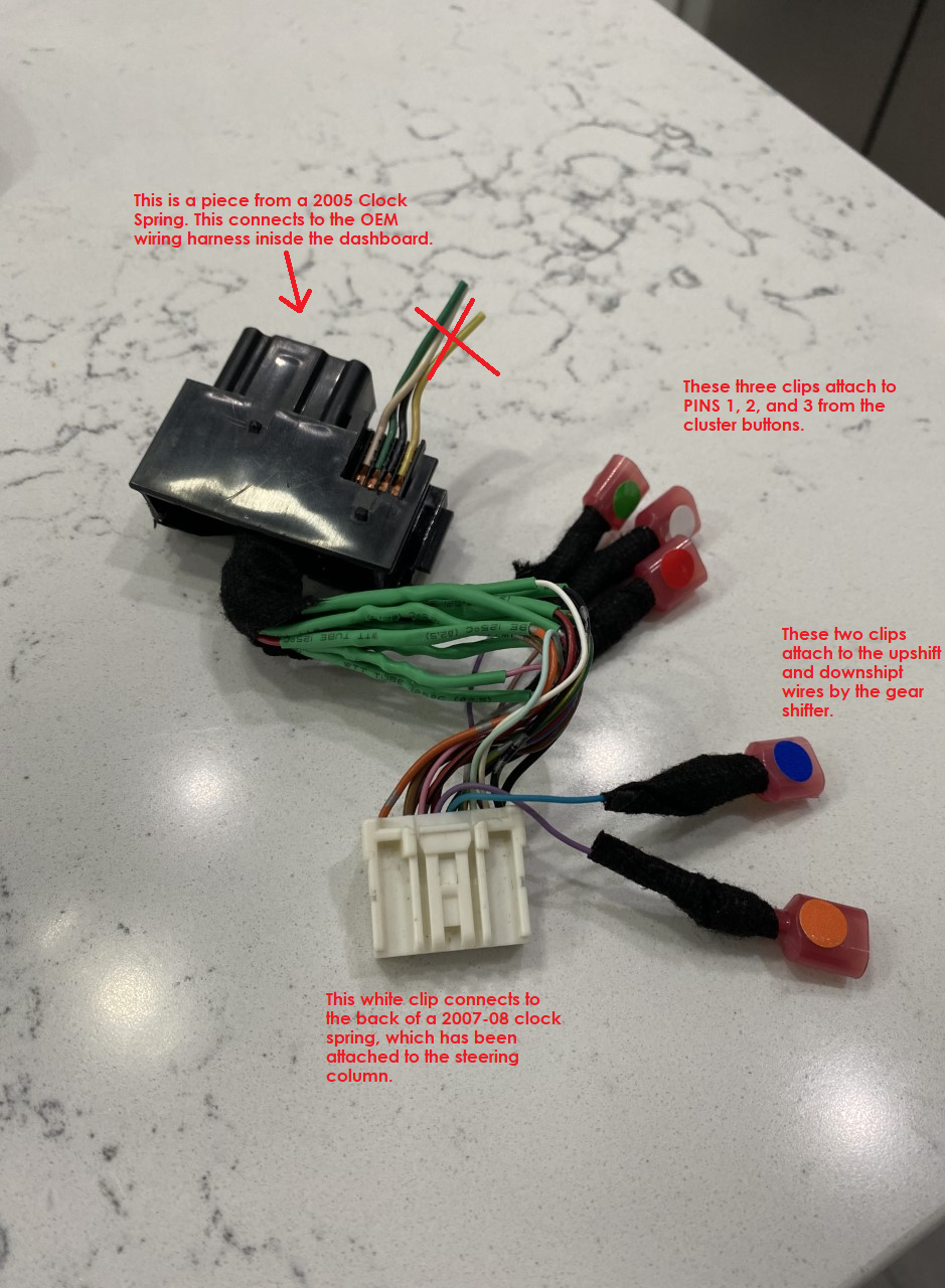 Furthermore, there are 5 wires that need to be connected inside your TL to maintain gauge cluster buttons and to incorporate the paddle shifters. That's why you see 5 wires dangling within the below wiring harness. These are also highlighted separately in my conversion chart in DIAGRAM 1.
