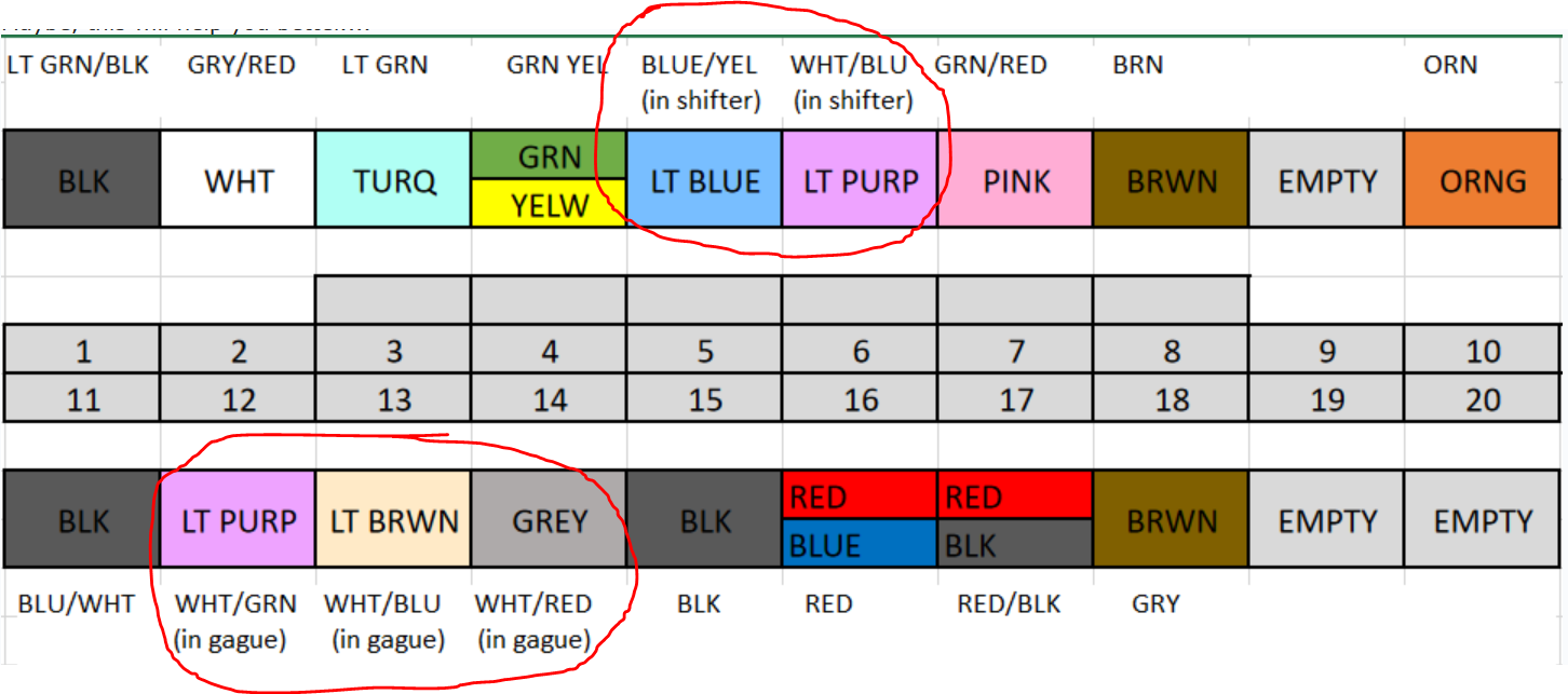 Blue: These two pins need to be wired to the two upshift/downshift wires in the gear shifter