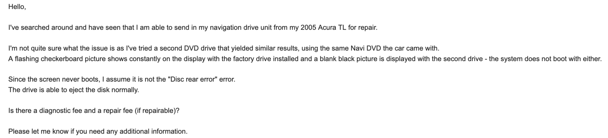 I mailed my nav drive unit with the disk (at their request), along with a note about the EXACT issue I was having, and they shipped it back once repaired and paid.
