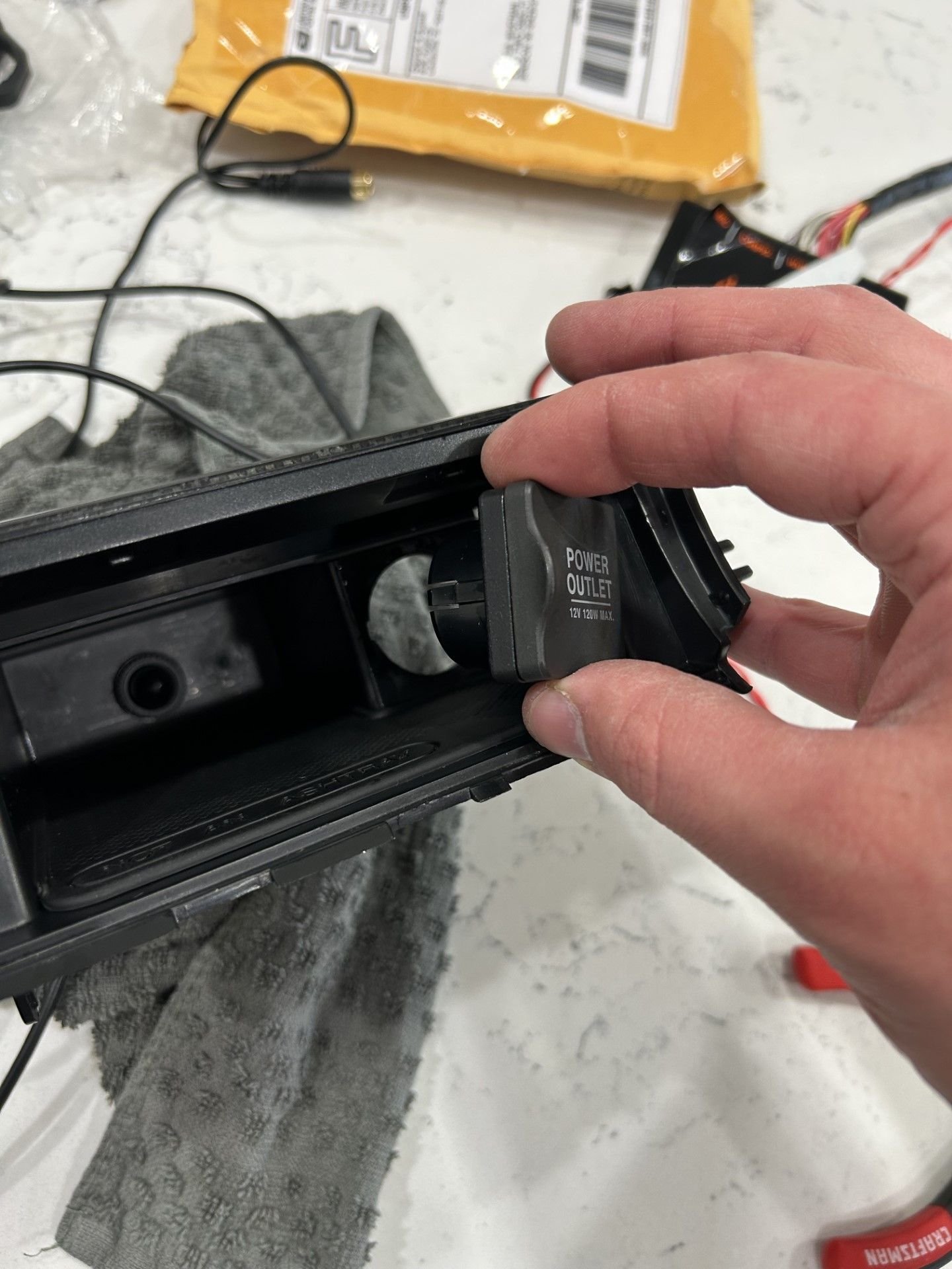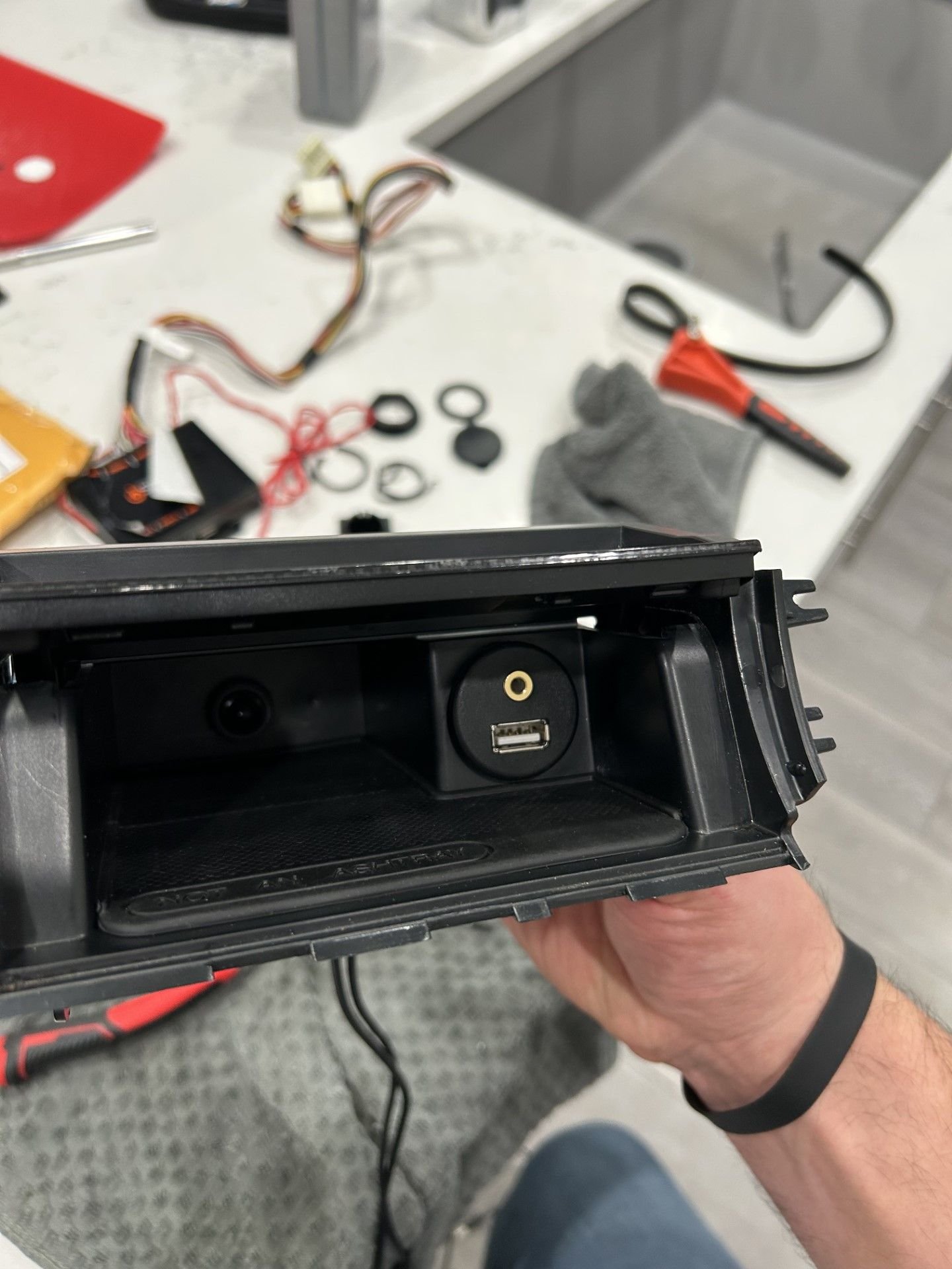 You may notice that I had to install a water bottle cap to be used as a washer. The nut that holds the aux/usb port in place kept hitting the cubby because it was so tall.
