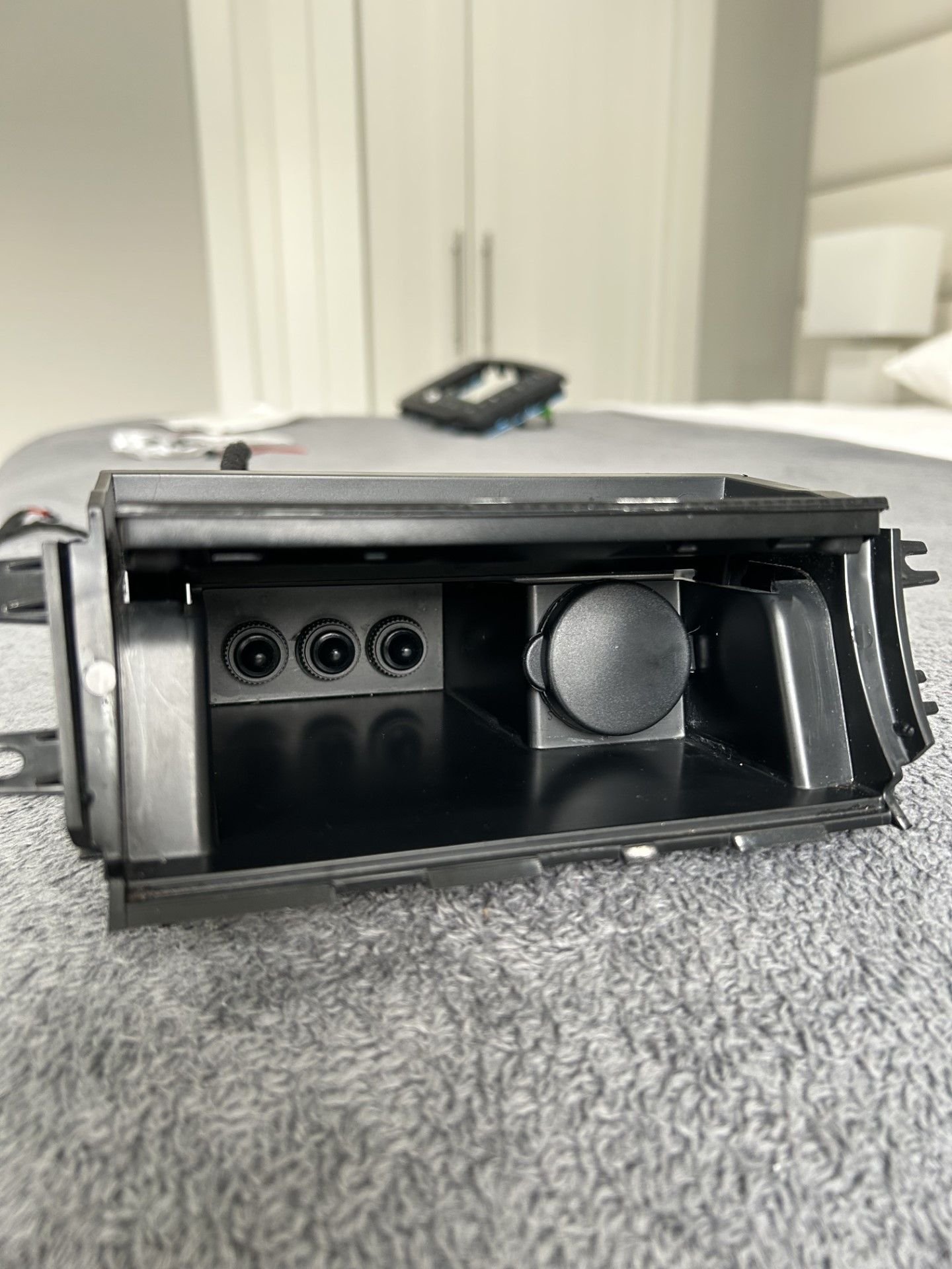 I forgot to take pictures of this step, but I essentially centered/ the unit inside the navigation bezel by cutting and sticking furniture pads along the edge of the bezel. Then I drilled four holes in the back of the OEM metal casing, so that I could install 4 bolts with vacuum caps. I also cut out a section on the backside of the metal casing so that the cords could feed through more easily.
