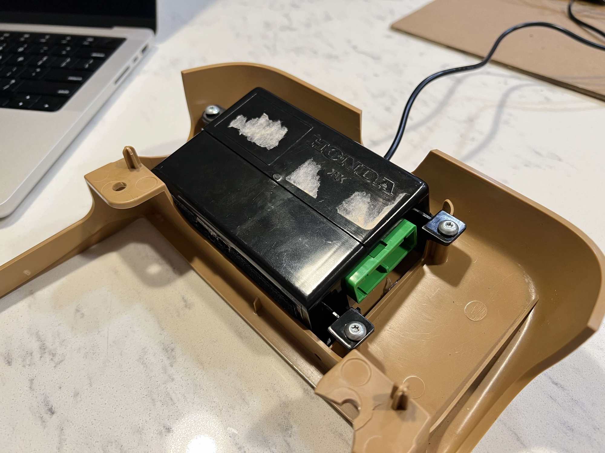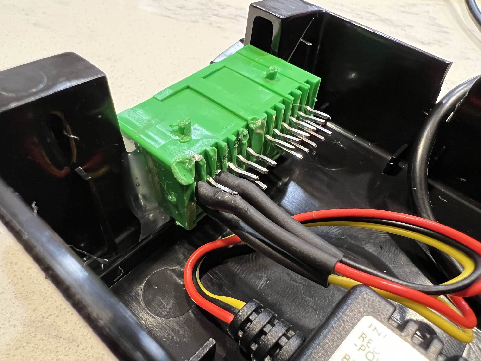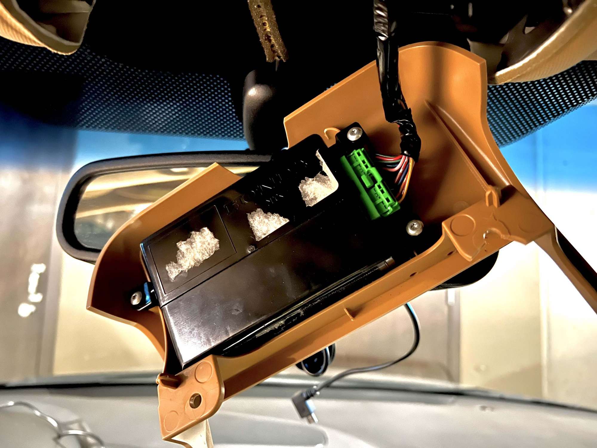 Playing devil's advocate, my only concern is how the green connector was re-mounted. Hot glue does not hold up well in heat, especially during the summer time. I'm from Michigan where it doesn't get exceptionally hot and even I've experienced issues with hot glue before. Given that this connector is mounted so closely to the windshield with little to no shade cover, I see a potential risk. JB weld might have been a safer choice.