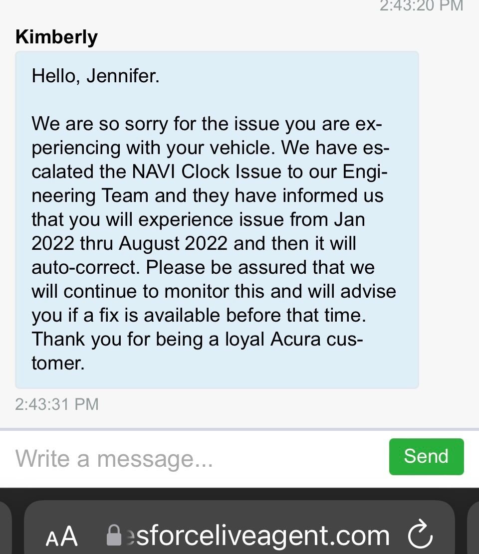 Please be assured that we will continue to monitor this and will advise you if a fix is available before that time. Thank you for being a loyal Acura customer."