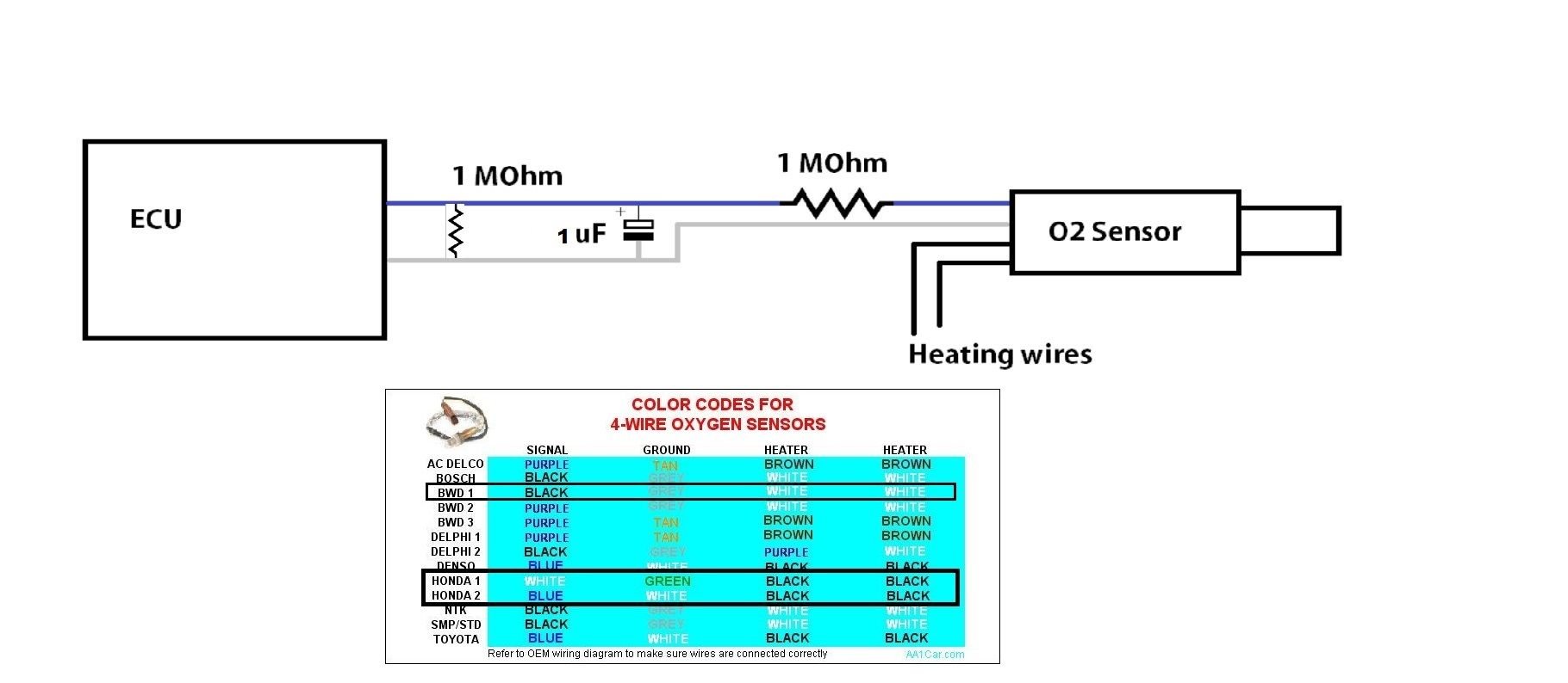 However, after installed for testing I got a high voltage code p0138, so it was easy enough to add another 1 megaohm resistor, after the cap across both wires, which smoothed the voltage sine wave and now is a steady 6 volts (within range).