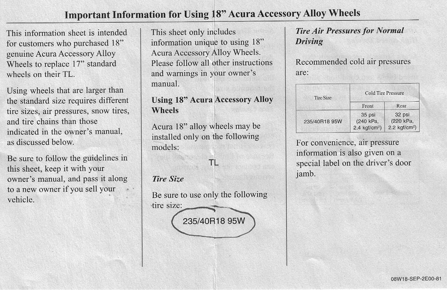 If you bought yout 18" wheels when you bought the car directly from the dealer, they should had put a sticker on the driver door with the right pressure you should put on the 18" tires, but if you got your rims (acura or aftermarket) and for whatever reason you dont have that so called sticker, here are the numbers, taken directly from each 18" Aluminum Wheel owners manual.