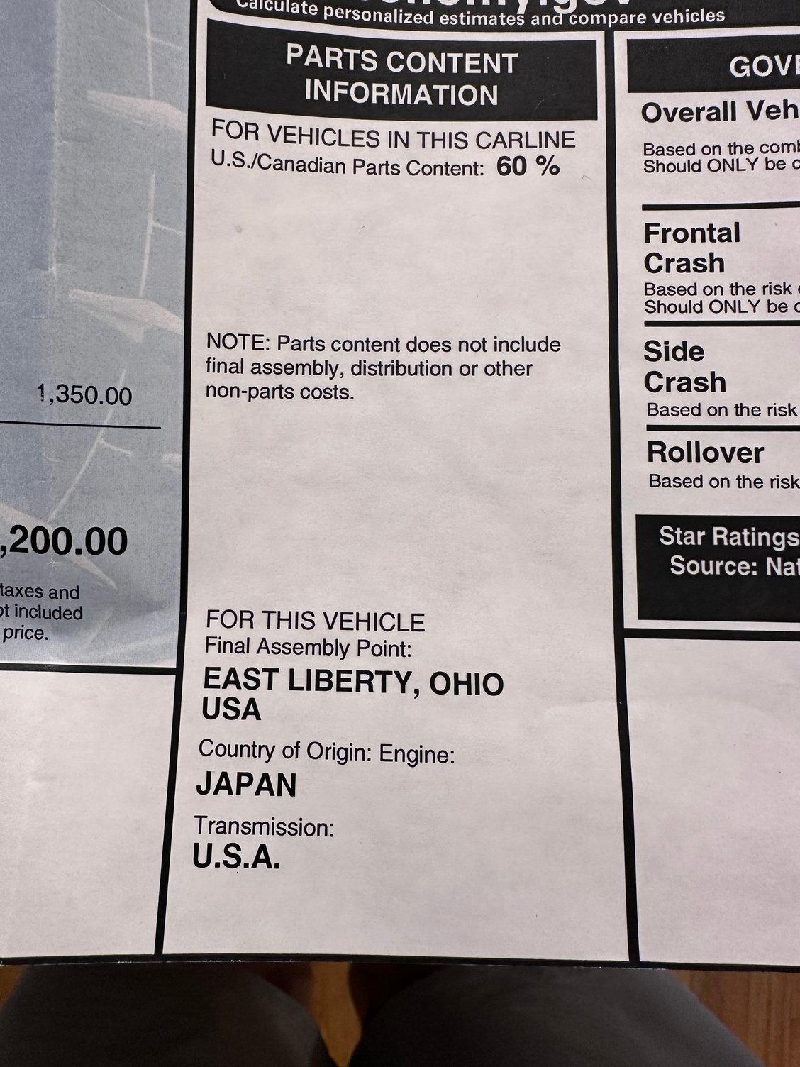 2025 NHTSA report - shows MDX and TLX type s as having Japan as the source of the engine. MDX type S shows 55% US parts whereas regular MDX shows 65%. Not sure how that is calculated