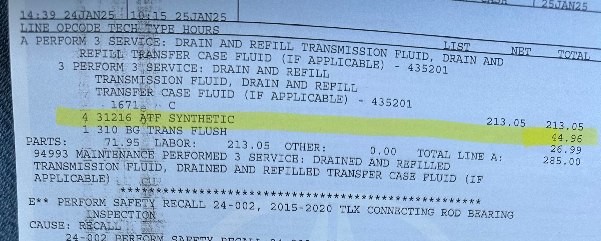 Does 4 quarts of ATF 3.1 for $45 total sound right? That’s around $11/quart. After doing some research every other dealership chargers $200+ more for this service and the 3.1 fluid by itself is usually around $23/quart, which leads me to believe they aren’t invoicing for the 3.1 fluid lol hope this makes sense