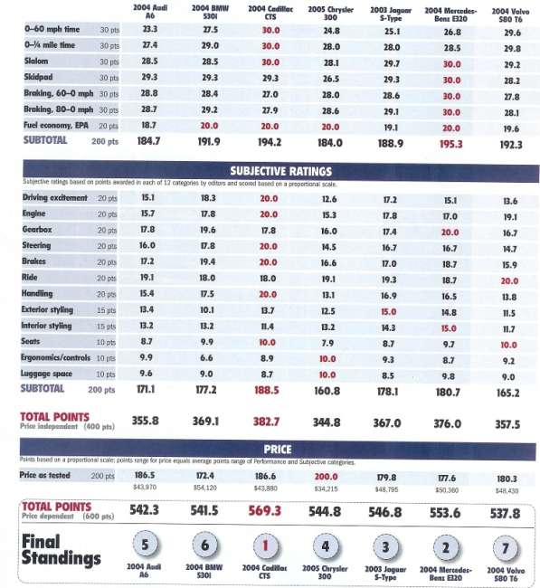 I am reading that the CTS came in 1st out of 7 luxury cars at a Road and Track mag comparo. It beat out the: