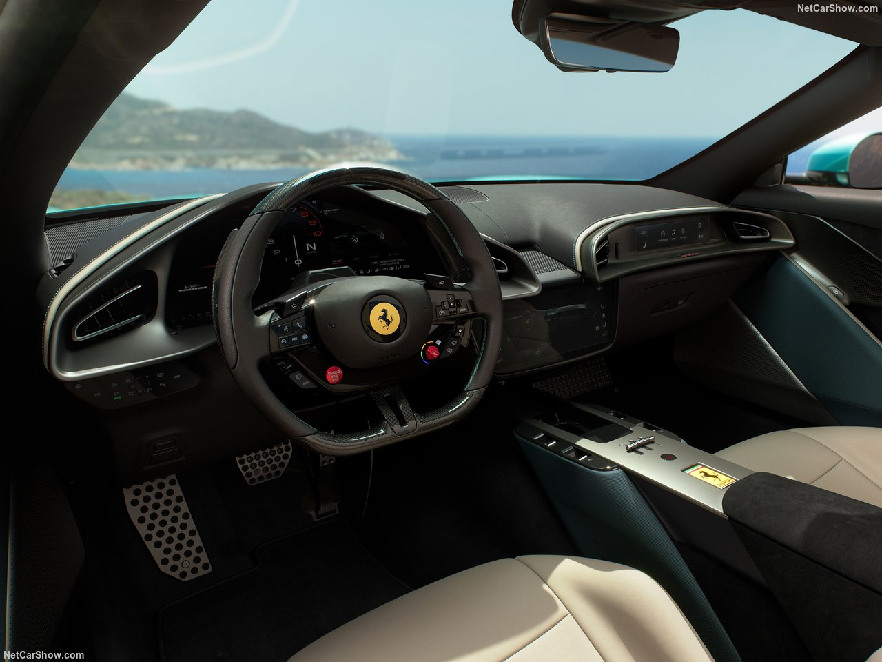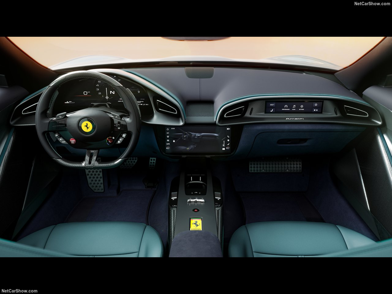 The rear is defined by a strong character line that wraps around the entire volume, culminating in a compact and clean tail. The tail lights are hidden within essential graphic cuts, evoking classic Ferraris while using a modern visual language. The wide and functional diffuser openly declares its aerodynamic purpose, while the rear screen merges with the spoiler profile, creating a distinctive stylistic signature. Highlighting the car's personality, the launch colour, Verde Costiera - a brilliant teal green inspired by the reflections of the sea along the Amalfi coast - enhances the sculpted surfaces and brings a fresh, vibrant look to the whole.