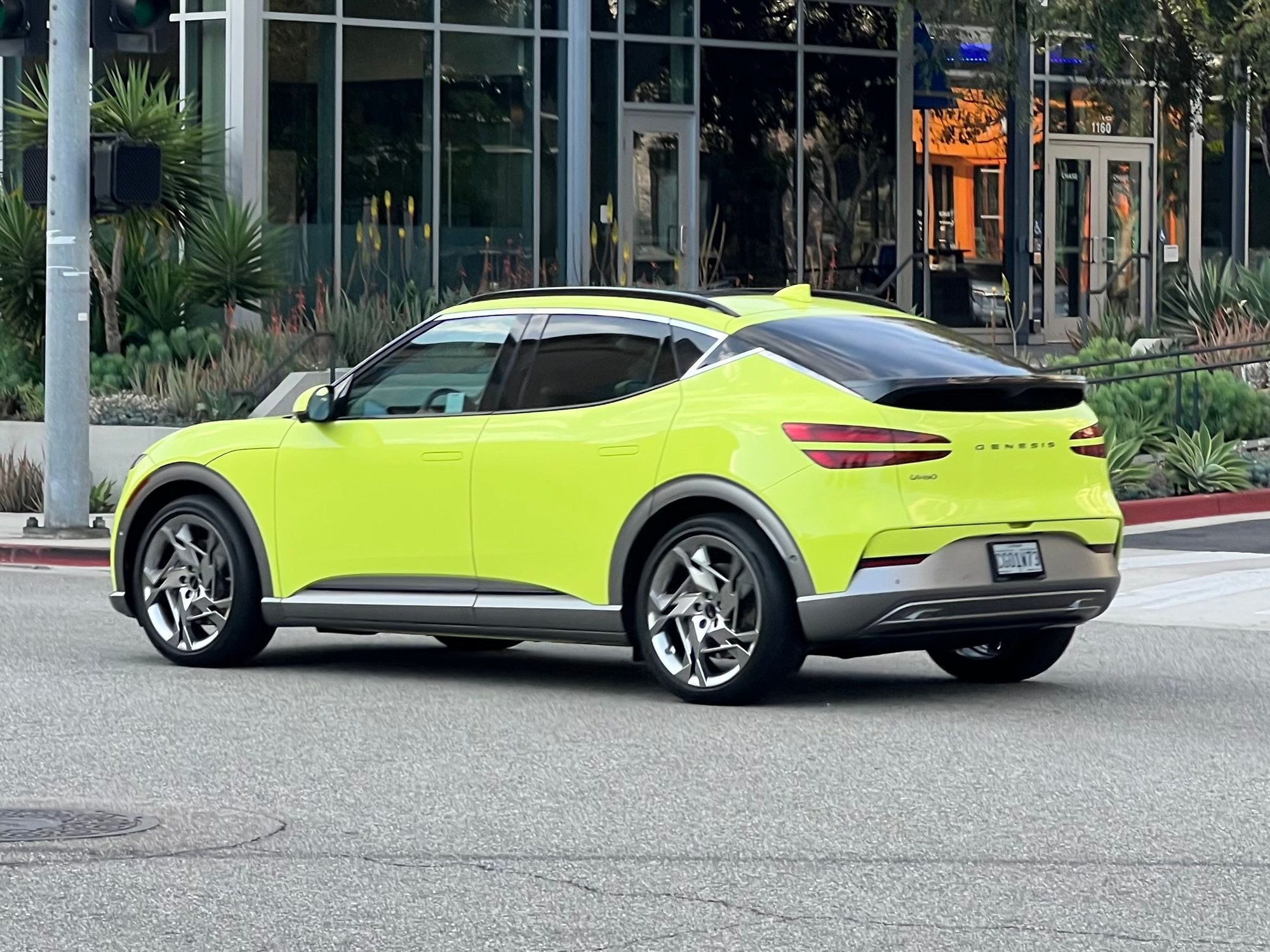 The side profile view gives us a vague idea of the vehicle's size, which appears to be smaller than its sister models from Hyundai and Kia. The impressively short overhangs – especially the rear one – associated with dedicated EVs means the wheelbase has been maximized for greater rear legroom. The swoopy roofline makes Genesis' first bespoke electric car sportier, but it likely eats into rear headroom and cargo capacity compared to its mainstream siblings.