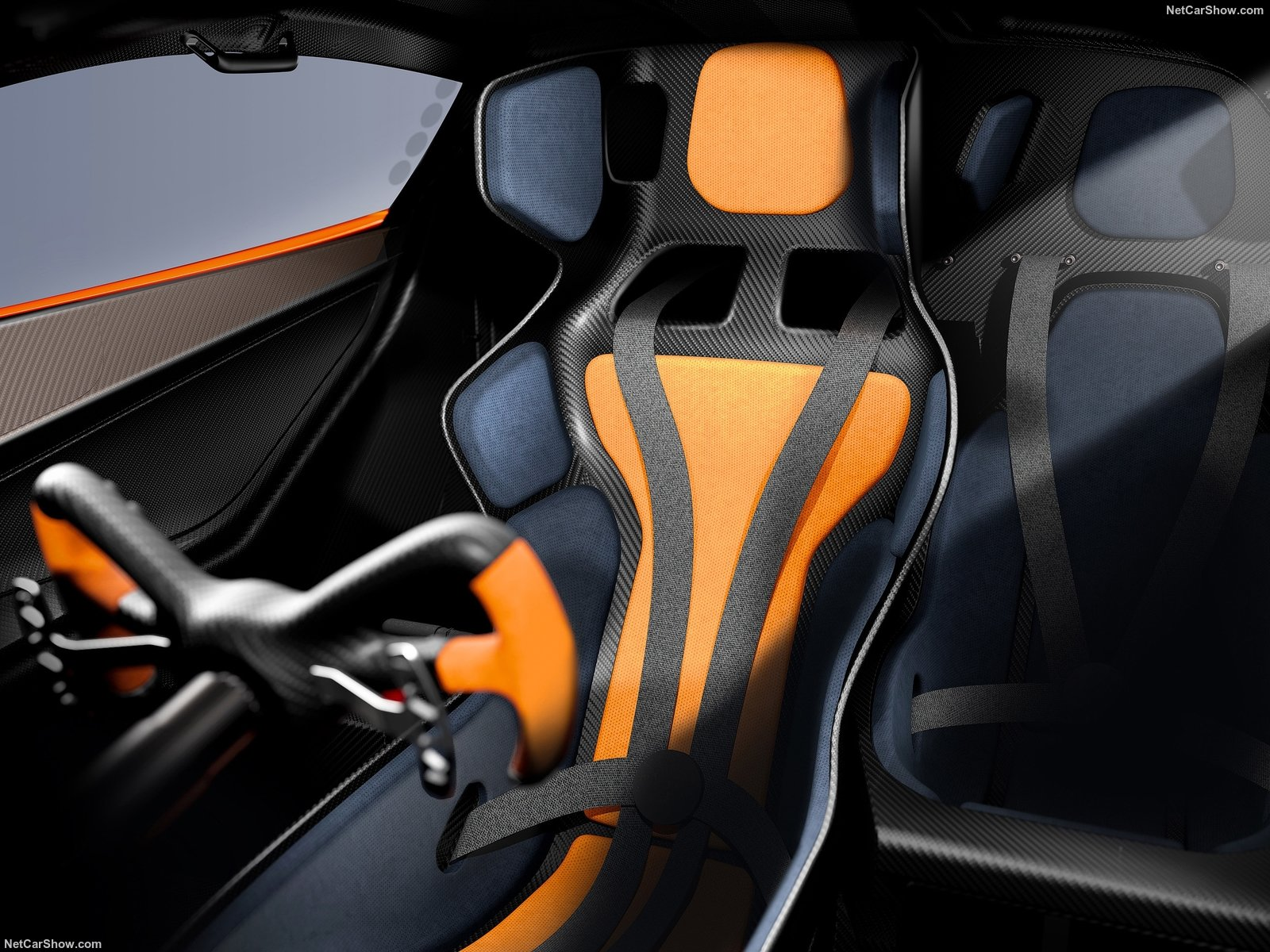 The rectangular carbon fibre steering wheel is a lesson in simplicity, featuring only the key controls that the driver needs. This includes buttons for the traction and launch control, as well as the car-to-pit/driver-to-passenger radio and to select neutral. The slim, uncluttered design is influenced by Murray's racing experience.