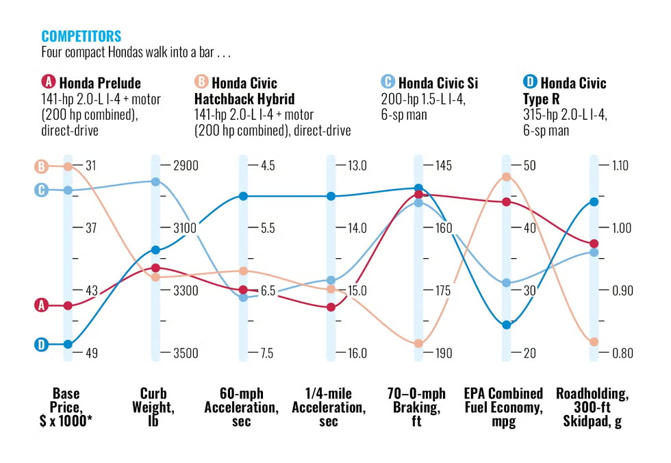 All the hullabaloo surrounding the new Honda Prelude's $43,195 base price has largely overshadowed what most enthusiasts really care about: performance. Now that we've finally had the chance to strap our testing equipment to the hybrid two-door hatchback, we have answers to some burning questions, like whether the resurrected Prelude is quicker than its powertrain donor—the humble Honda Civic Hybrid—as well as how its test results compare with other racy Civic models.