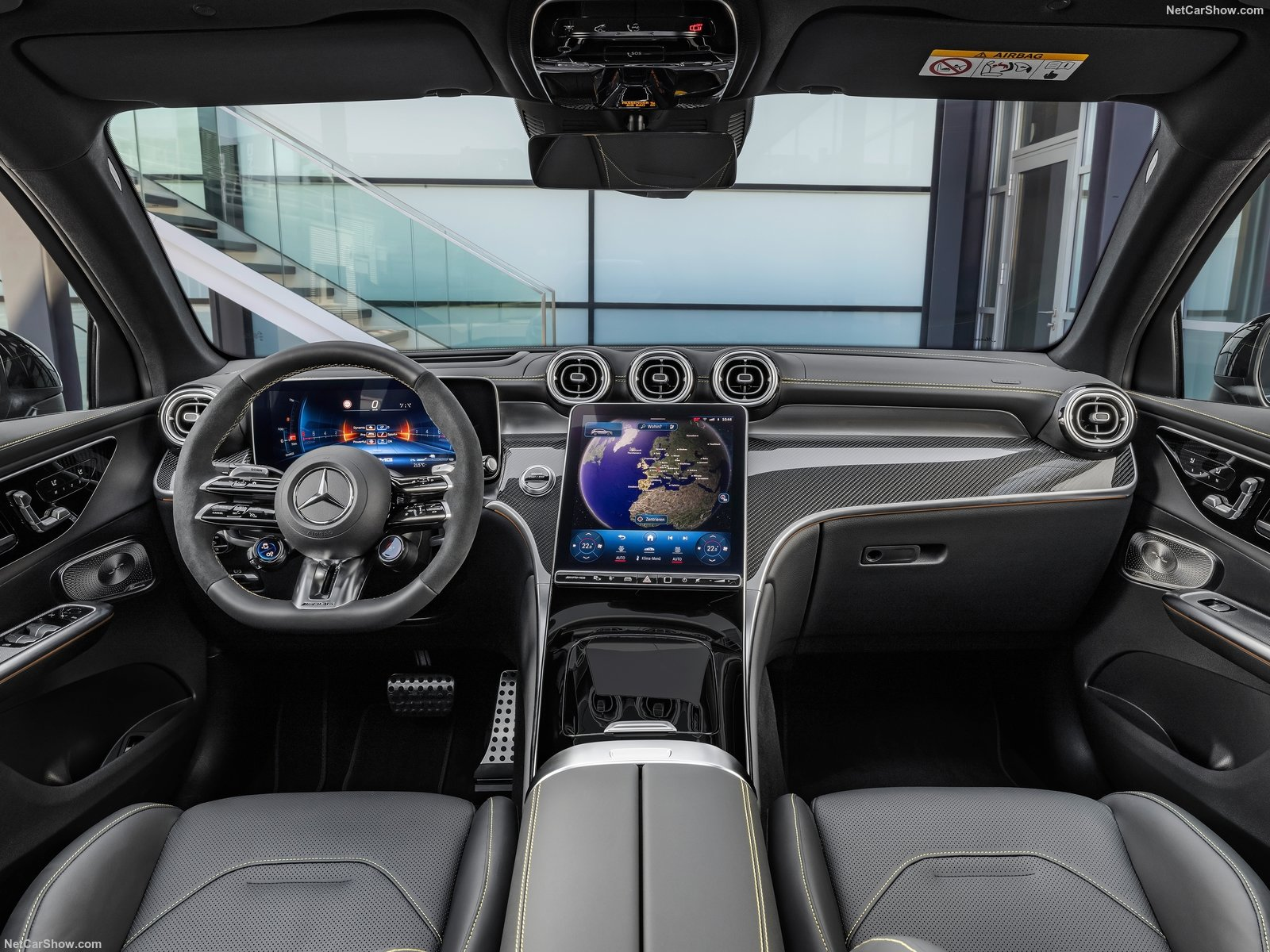 The AMG Performance steering wheel in nappa leather (GLC43) or nappa leather/MICROCUT microfibre (GLC63 S) is also fitted as standard. It is flattened at the bottom, perforated in the grip area and equipped with silver-coloured aluminium gearshift paddles. The two round AMG steering wheel buttons allow fast and unerring operation of various dynamic driving functions and of the AMG DYNAMIC SELECT drive programs. The sporty-luxurious atmosphere is rounded off by AMG sports pedals, AMG floor mats and illuminated door sill panels with AMG lettering.