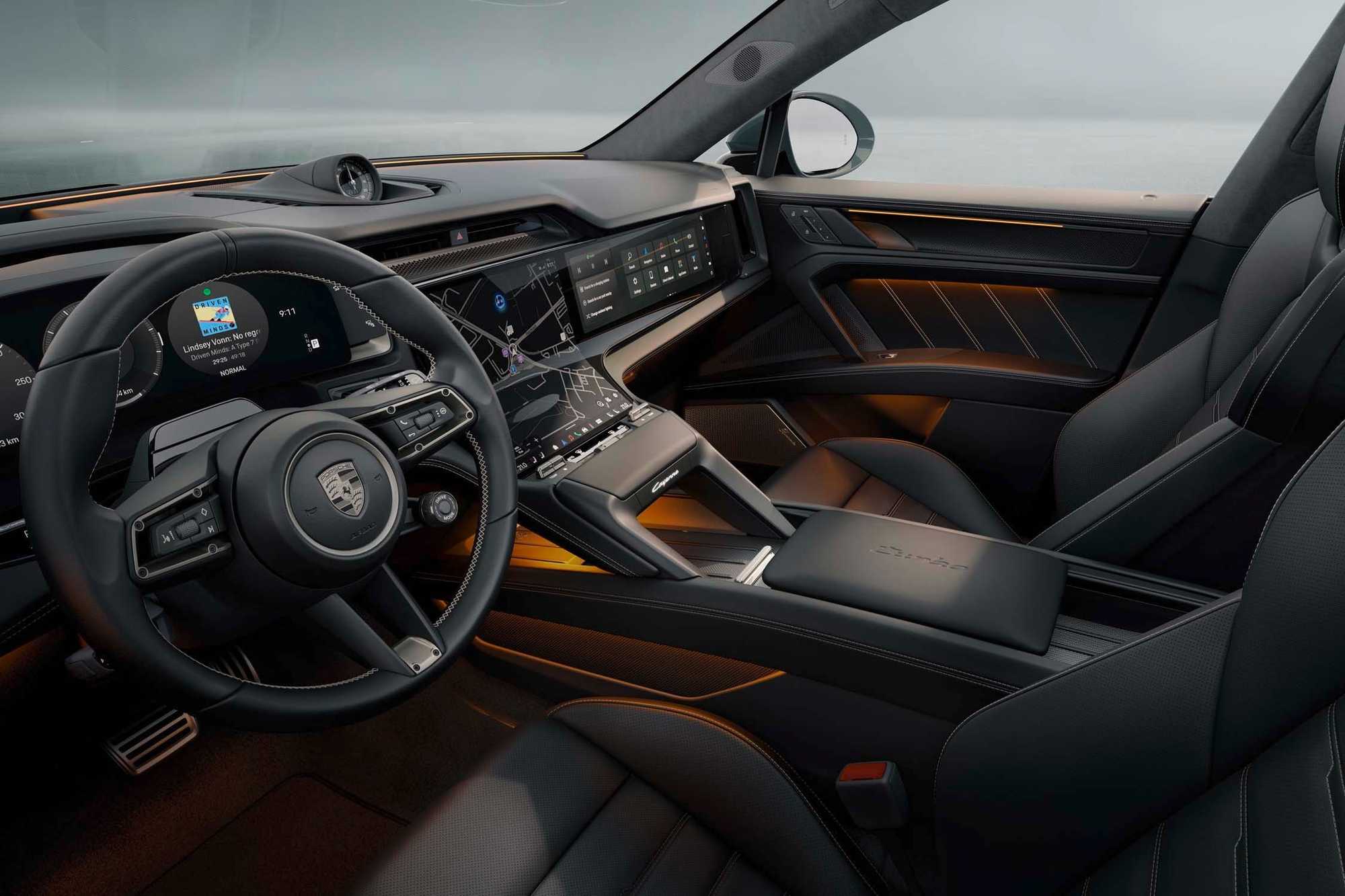The new Porsche Digital Interaction display and operation concept combines touch surfaces, physical controls and an ergonomic hand rest to create a driver-oriented user interface. The Flow Display, an elegantly curved and harmoniously integrated central screen, forms the focal point of the digital architecture. A new operating system enables streaming, gaming, app integration, and AI-powered voice control. Personalisable user profiles, widgets and themes create an individual user experience. Mood Modes combine ambient lighting, seats, displays, sound profiles and climate control to create holistic worlds of experience. This is all complemented by a new surface heating system, new massage functions and communication light.