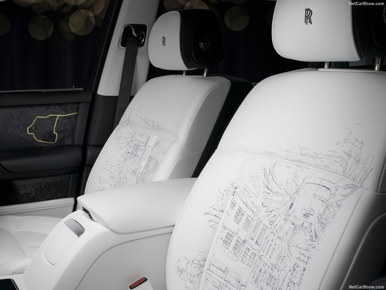 The leather on the front seats features laser-etched artwork based on hand drawings by a Bespoke designer, evoking the draftsman's craft. Among the motifs are symbolic details that elegantly carry the extraordinary weight of Phantom's 100-year legacy, from a rabbit design - a nod to "Roger Rabbit," the codename for the relaunch of Rolls-Royce in 2003 - to a seagull, the codename for the 1923 Phantom I prototype.
