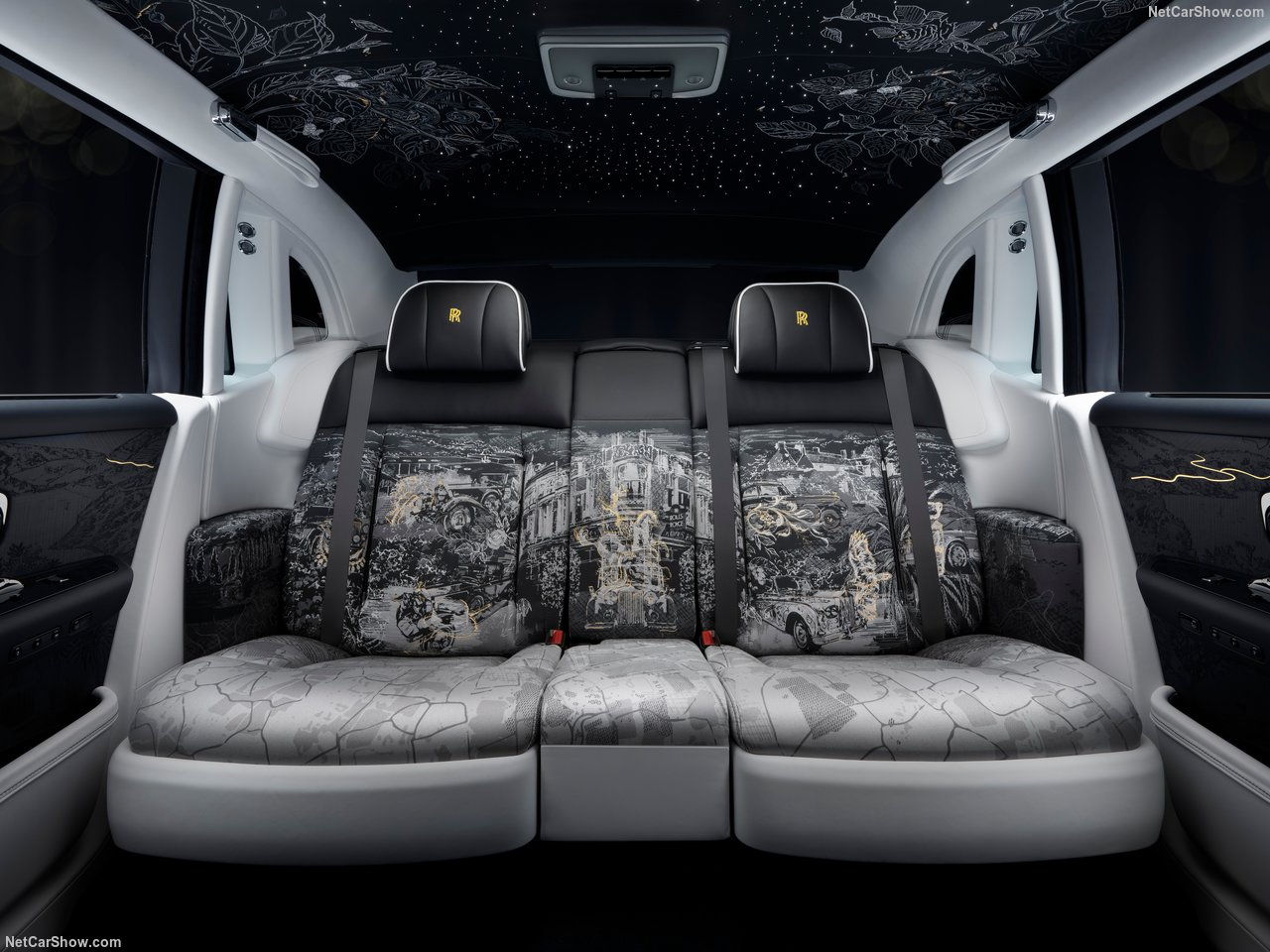 The rear seats of Phantom Centenary are inspired by the famed 1926 'Phantom of Love', commissioned with handwoven Aubusson tapestries. The artwork on the seats unfolds across three distinct layers of storytelling. The first is the background, rendered in high-resolution print, showing places and artefacts from Phantom's history - from the marque's original Conduit Street premises in London to Henry Royce's oil paintings of Southern France. The second layer, also printed in high resolution, portrays great Phantoms of the past in finely drawn detail. The third and uppermost layer is formed of embroideries, abstractly representing seven significant owners from every generation of Phantom.