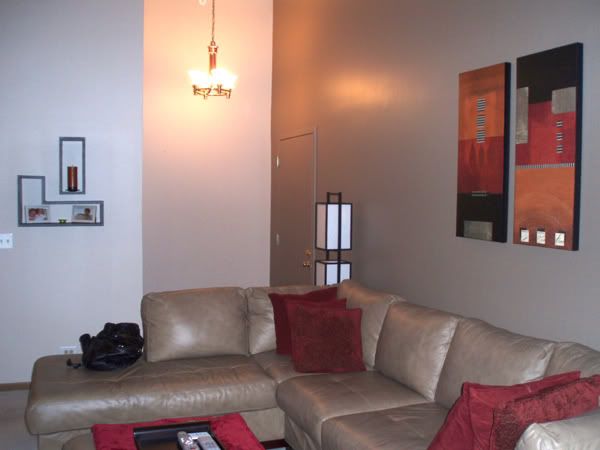 The red wall is awesome...you can't tell from the pics, but the walls are light tope and the couch wall and back dining room wall are a dark tope....everything in my place is tope, red, and black.