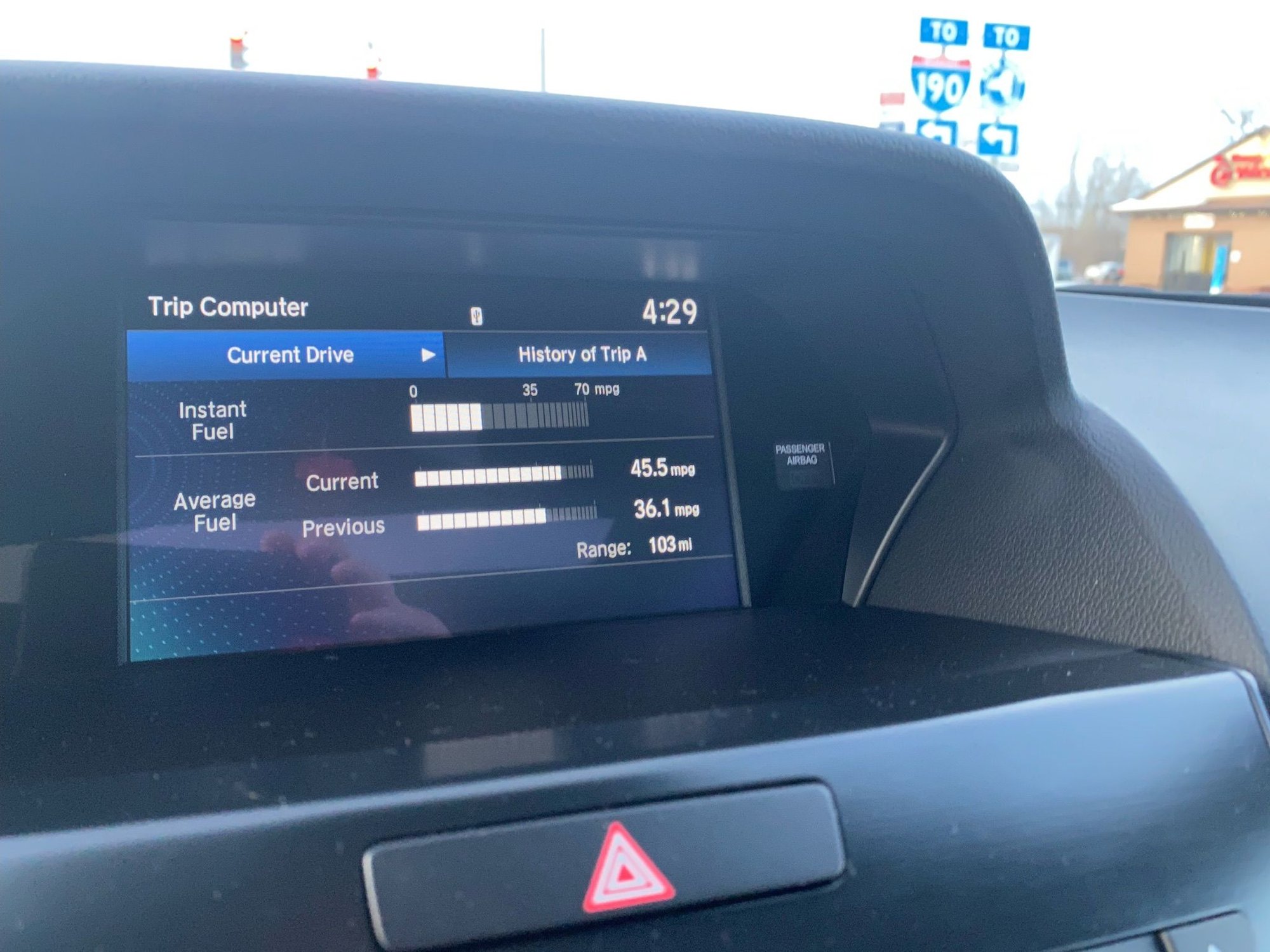 I decided to put some of these to the test, and I decided to go on a total of 240 mile drive (10% city, 90% highway, 120 miles each way). Going both ways I used 70 MPH speed with Adaptive Cruise Control on. I experienced about 5 min of 10-20 MPH average traffic each way, and occasional drivers that jumped in front of me and messed with cruise control since the car braked automatically. Also, I took a road that has a fair amount of climbing up hills and cruising down hills. 1500 feet difference in climbing and cruising down. I averaged around 60mph going up hills. Stock 17 inch tires were around 32-33 psi, and I was using 91 Premium gas from Valero Gas station.
