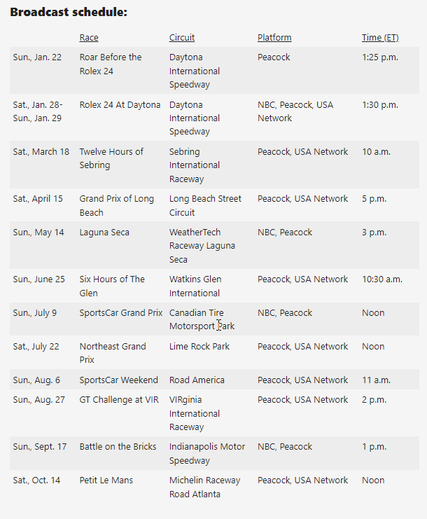 "We’re looking forward to showcasing the exciting, competitive racing in the IMSA WeatherTech SportsCar Championship in 2023 and starting the engines in just a few short weeks with the iconic Rolex 24 at Daytona,” said Matthew Grassie, director, programming and rights management, NBC Sports. “IMSA fans won’t miss a minute of the action throughout the season with the return of comprehensive live race coverage on Peacock and extensive coverage on NBC and USA Network.”