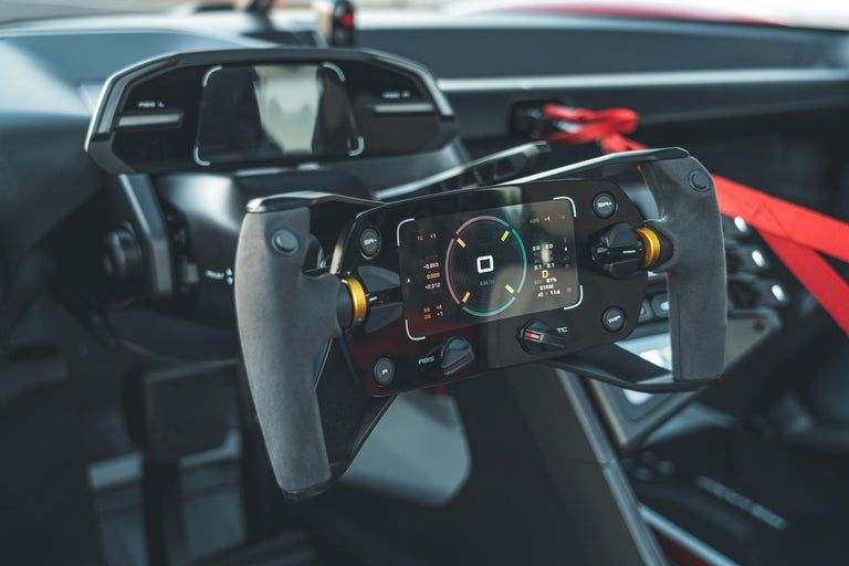 Inside, the seat pads are 3D-printed to match each driver's backside. The displays and main switches populate the steering wheel. Cleverly, the helmet holder incorporates a dryer and disinfecting agent. Very post-pandemic.
