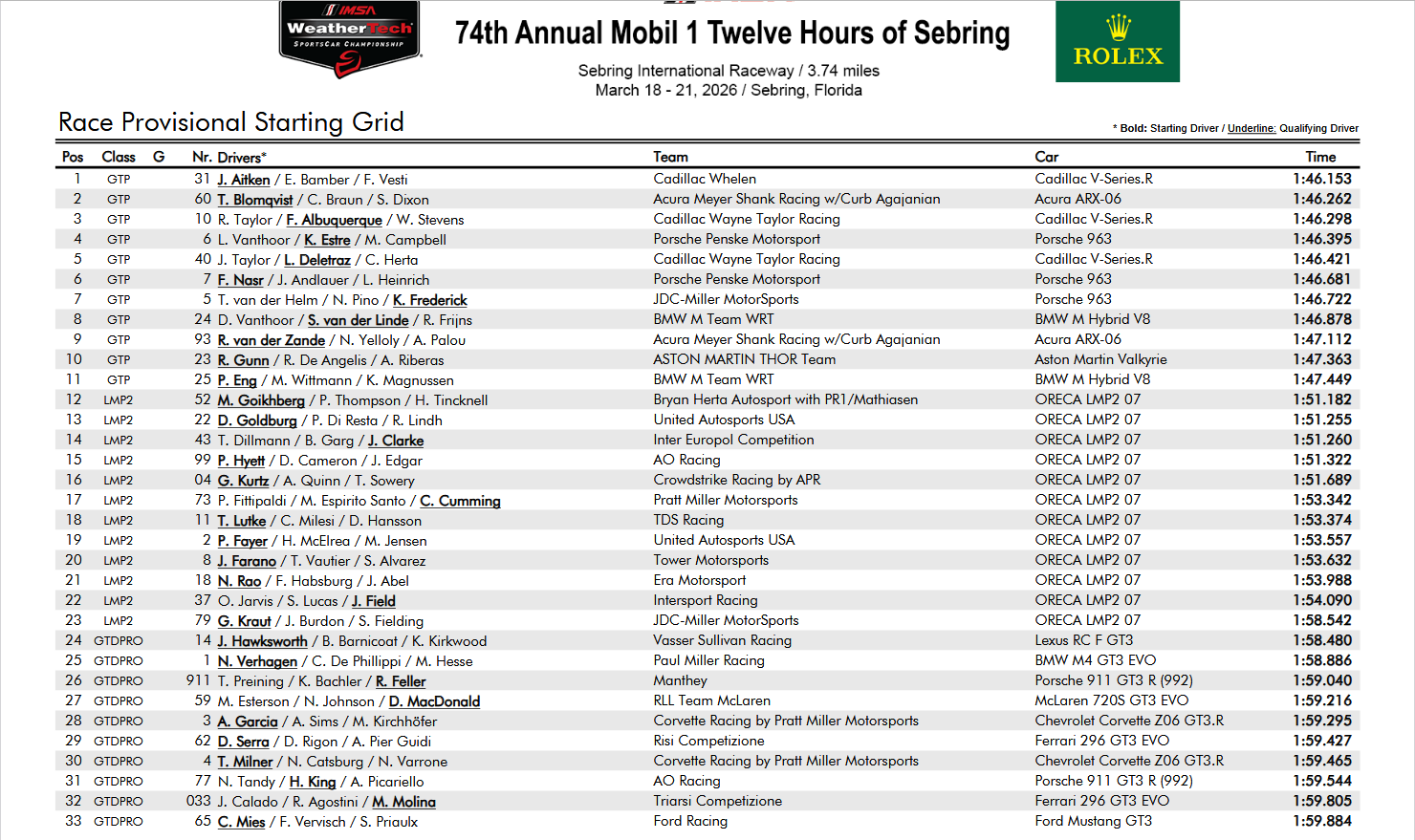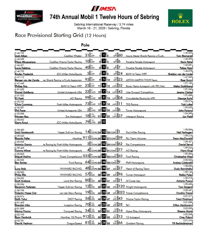 Interesting results. The Penske Porsche is only 1 sec off the Audi's pole time. Highcroft Acura placed a good 4th.