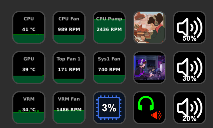 I bought one of those Elgato Stream Deck's a while ago not entirely sure what I'd use it for but I've got a decent setup now. I'm using about half of it to monitor temp and fan speeds, and the other half is audio shortcuts to preset volume levels, Lofi girl live streams for background music and button to quickly switch between headphone and speaker audio output.