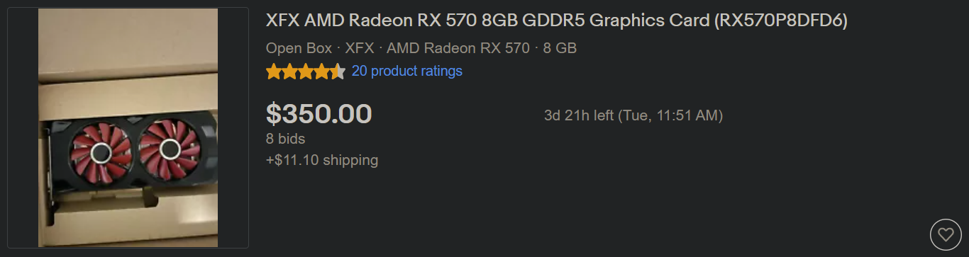 Crap, there's a market for video cards? I have a "used once to test something" XFX Radeon RX 570 8GB sitting in its box right here.