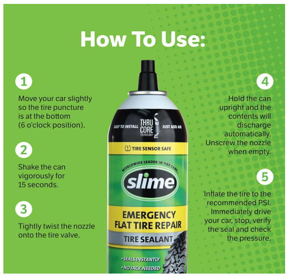 5) Use the tire inflator to, hopefully, find joy allowing one to quickly get back on the roadd to locate the nearest tire repair facility.