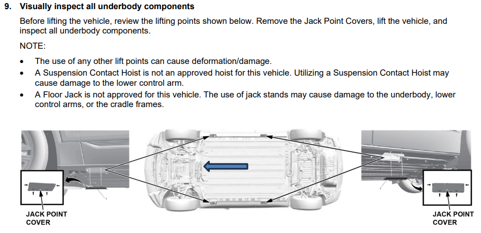Looks as if a full lift if the only approved way to get this vehicle off the ground. No floor jacks. In other words, the entire car comes up at the same time. I can understand why this would be. I would not be surprised if this is common of most EVs.